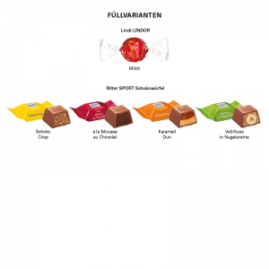 Füllvarianten: 4 Ritter SPORT Schokowürfel oder 1 Beutel mit 3 Lindt LINDOR Milchkugeln