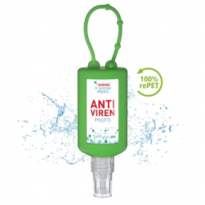 Praktische Flasche zum Anhängen! Das Fläschchen mit Silikonhülle ist nicht nur optisch ein echter, Raffiniert mit Schlaufe zum Anhängen ans Handgepäck, an den Rucksack oder an den Kinderwagen. 50 ml Flasche aus 100% recyceltem PET, transparent mit leichter mit Pumpaufsatz "transparent" mit Schutzkappe; Silikonhülle und Schlaufe in Nachfüllbar. Dekoration: Body Label: Etikett PE (weiß) auf Vorder- und Rückseite, Druck 4c CMYK. Wahlweise glänzend oder matt. Das alkoholische Hände-Desinfektionsspmittel verfügt aufgrund seiner Zusammensetzung über ein breites Wirkspektrum gegen Viren, Bakterien und Hefen. Es eignet sich für eine hygienische Händedesinfektion gemäß DIN EN 1500 bei einer Anwendung von nur 30 Sekunden. Spezielle Pflegekomponenten schonen die Haut auch bei häufigerer Anwendung und halten sie geschmeidig. •Schnell wirksam gegen Corona-Viren innerhalb von 30 Sekunden •Tötet 99,99 % aller Bakterien. Begrenzt viruzid, levurozid. •Hautschonend mit Pflegekomponenten •Dermatologisch "Sehr gut hautverträglich" getestet •Inklusive gesetzlich vorgeschriebenem "tastbarem Warnzeichen" •Hergestellt in Deutschland Wirksamkeit bestätigt gemäß DIN EN 1500, 13727, 13624, 14476. Enthält pro 100 g als Wirkstoff: Ethanol (50 g/100 g), Isopropanol (25 g/100 g). Biozide sicher verwenden. Vor Gebrauch Etikett und Produktinformation lesen. Reg. Nr. UFI G600-606D-H00S-5S7W BAuA Reg. Nr.: N-100781