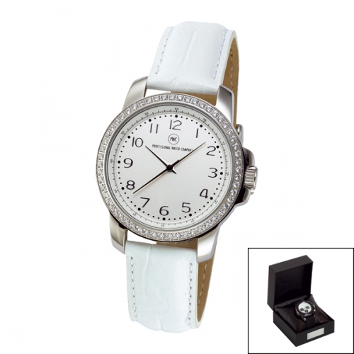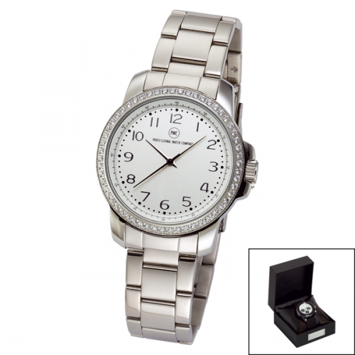 Edelstahlgehäuse poliert mit Kronenschutz und Schraubboden, Gehäusering mit Kristallsteinen besetzt, wasserdicht 5 bar nach DIN 8310, poliertes Massiv-Edelstahl-Gliederarmband mit Faltschließe, gehärtetes Mineralglas, Markenuhrwerk von Miyota (by CITIZEN), 5 Jahre Garantie, Designerbox inkl.
