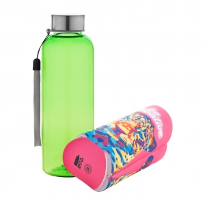 RPET-Flasche mit Edelstahlverschluss in individueller RPET-Neoprenhülle. Der Preis ist inklusive dem Sublimationsdruck. Füllmenge: 500 ml. Mindestmenge: 50 Stk. Nicht geeignet für kohlensäurehaltige Getränke.
