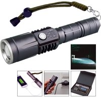 Artikel-Nr: 57371035TI-0010 Watt CREE LED Super-Powerleuchte mit Fokussierung und Powerbank Funktion. Diese außergewöhnliche Design-Leuchte ist ein Multitalent für Zuhause und unterwegs. Mit ihrer beeindruckenden Leuchtkraft von bis zu 500 Lumen spendet sie einen sehr hellen und weitreichenden Lichtstrahl (über 150 Meter). Durch das robuste, wassergeschützte high-end Aluminiumgehäuse ist sie der perfekte Begleiter bei der nächsten Reise, bei vielen anderen Freizeitaktivitäten sowie bei Reparatur- und handwerklichen Tätigkeiten. Die hochwertige CREE LED Typ XM-L T6 kann in drei verschiedene Leucht-Modi geschalten werden: 100%, 50% sowie eine Signalfunktion. Durch Herausziehen des Leuchtenkopfes kann der Lichtstrahl fokussiert werden. Ebenfalls kann die Leuchte mit ihrer eingebauten Energie auch als Ladegerät für Smartphone, Navi und viele andere mobile Geräte über USB verwendet werden. Der 2600 mAh starke Li-Ionen-Marken-Akku wird mit dem mitgelieferten Ladekabel über die Steckdose aufgeladen. Durch eine Schutzschaltung ist eine Tiefentladung sowie eine Überladung des Akkus ausgeschlossen. Ladezeit ca. 9-10 Stunden, Brenndauer bei 100% Leuchtfunktion bis zu 2,5 Stunden möglich. Output: 4.2 V, 1000 mA. Hochwertige Karton-Geschenkverpackung mit Magnetverschluss inkl.