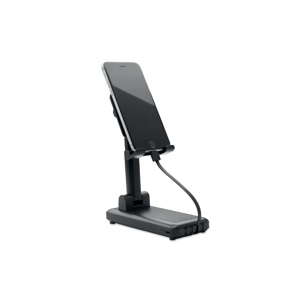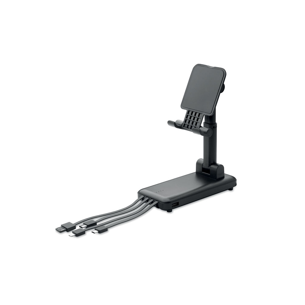 Artikel-Nr: OCBMO6863-03Powerbank 10000 mAh mit ausziehbarem und klappbarem Smartphone-Halter. Inkl. verschiedenen Kabeln. Ausgang: DC 5V/2A. ABS.