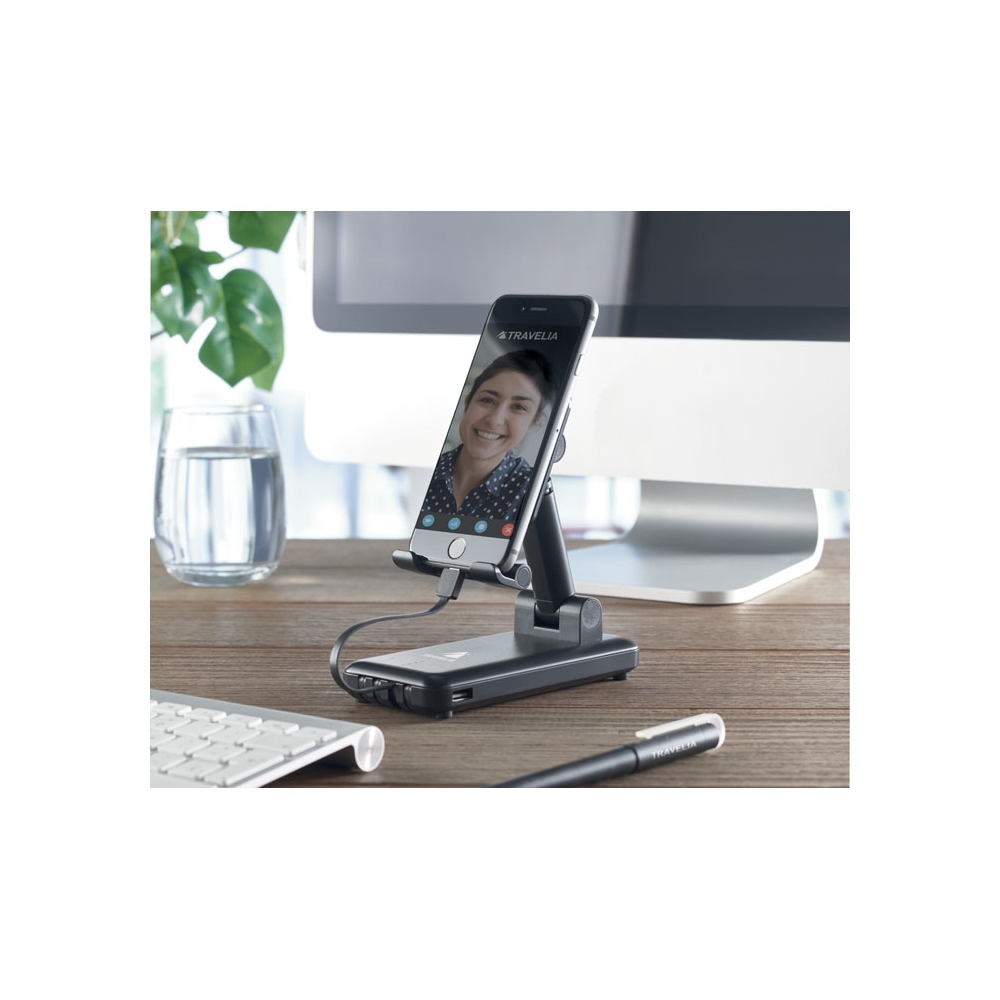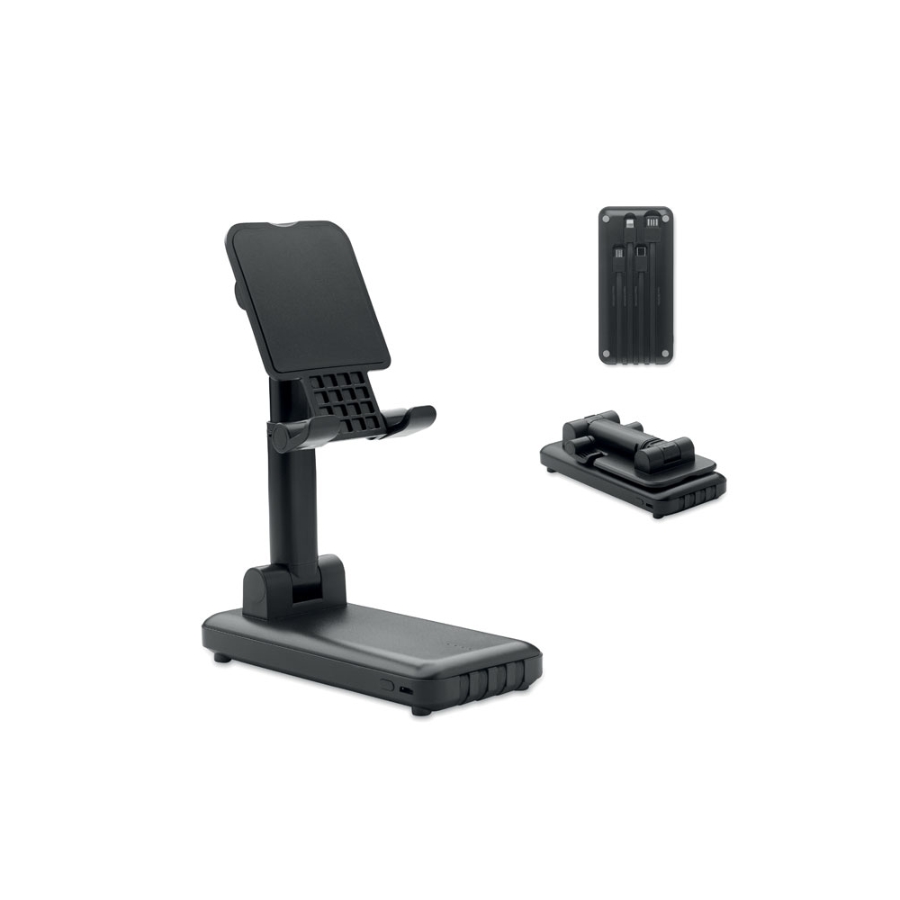 Artikel-Nr: OCBMO6863-03Powerbank 10000 mAh mit ausziehbarem und klappbarem Smartphone-Halter. Inkl. verschiedenen Kabeln. Ausgang: DC 5V/2A. ABS.