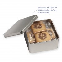 Artikel-Nr: 4941080-KL12Dieses Präsent erhält besonders viel Aufmerksamkeit - ob als Präsent beim Kundenbesuch, als Messe-Giveaway oder individualisiertes Geschenk bei Ihrem Kundenevent. 12 Vanille-Butterkekse werden mit Ihrem Wunschmotiv 1-farbig bedruckt sorgen so dafür, dass Ihre Botschaft in aller Munde ist. Die schicke Box wird zusätzlich mit einer eingesteckten Papierbanderole zu einem optischen Highlight auf jedem Messestand. Die Banderole bietet besonders viel Platz für Ihre Botschaften. Durch den Metallboden und Deckel wirkt die Box besonders wertig.