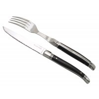 Artikel-Nr: 688DUB112Bambussockel mit 6 Laguiole Gabeln und 6 'Laguiole' Messern. Rostfreier Edelstahl, fein gezahnte Messerklingen, Griff aus schwarzem ABS.