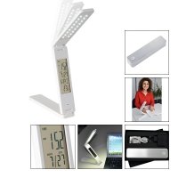 Artikel-Nr: 57372000WS-SI18 LED Tischleuchte mit Multifunktions-Display. Innovative und formschöne Leuchte mit 18 Warmlicht-LED(108 Lumen), die im Büro auf dem Schreibtisch genauso wie im Wohnbereich in Szene gesetzt werden kann. Durch den Dimmer kann die Lichtstärke um 50% reduziert werden und durch den neigbaren Leuchtenkopf lässt sich der ideale Beleuchtungswinkel einstellen. Das handliche Format und der integrierte Li-Ion Akku ermöglichen eine hohe Mobilität. Das Multifunktions-Display, betrieben mit einer Lithium Knopfzelle CR2025 (inkl.), informiert gut lesbar über Uhrzeit, Datum, Wochentag und Raumtemperatur (C° / F°). Die Leuchte kann über die Steckdose, eine USB-Schnittstelle oder den integrierten Li-Ionen-Akku betrieben und geladen werden. Im Lieferumfang ist eine Kunststoffplatte enthalten, um die Leuchte auch vertikal zu befestigen. USB-Kabel, Netzstecker mit USB-Adapter und hochwertige Karton-Geschenkverpackung inkl.