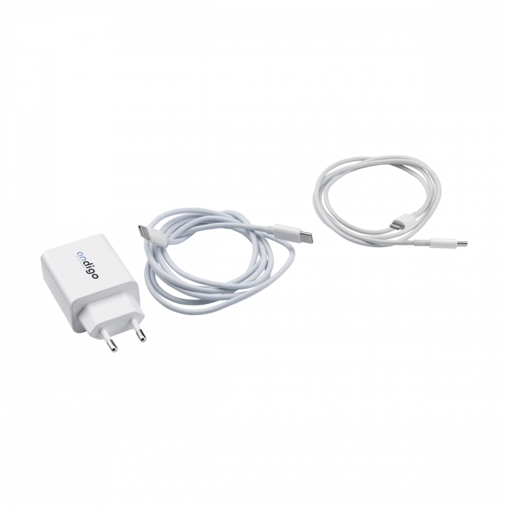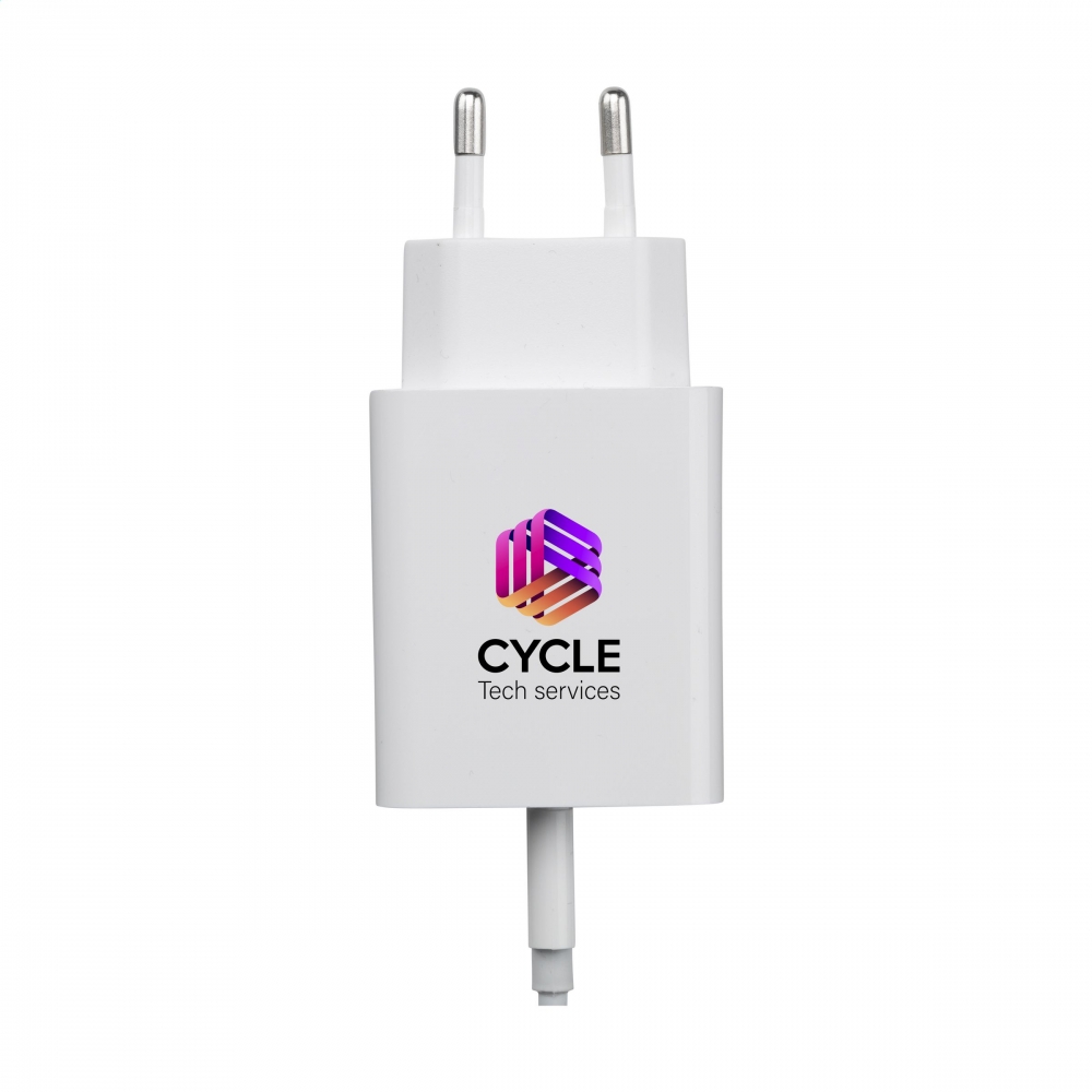 Artikel-Nr: CLP251710Ladegerät-Set aus recyceltem ABS. Dieses Set besteht aus einem Wandladegerät mit 2 separaten Ladekabeln: ein Kabel Typ-C zu Typ-C und ein Kabel Typ-C zu Lightning. Kabellänge: 100 cm. Inklusive Gebrauchsanweisung. Verpackt pro Set.
