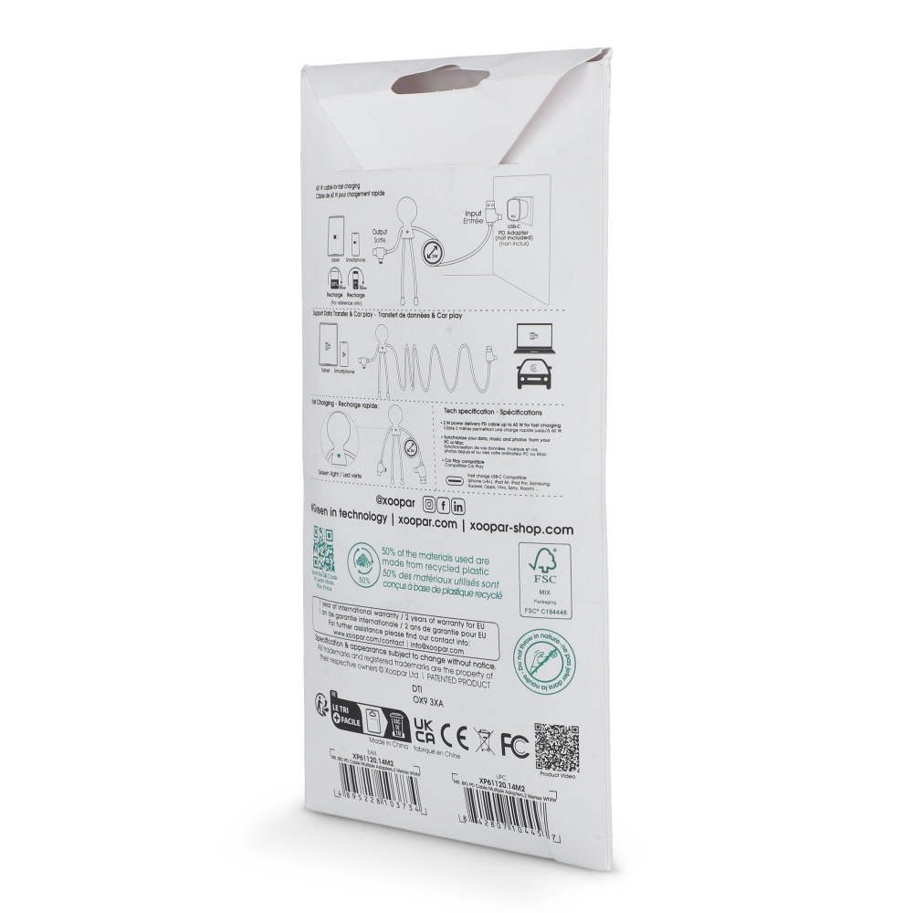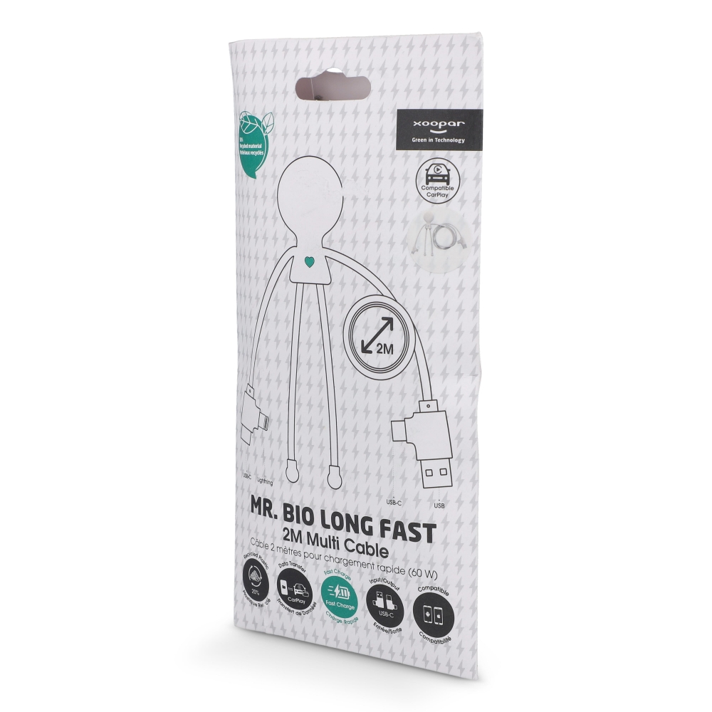 Artikel-Nr: ART41027N0001Xoopar Mr. Bio Long PD ist ein 2 Meter langes Multiladekabel mit USB-A, USB-C, Lightning und 60 W Schnellladung. Hergestellt aus 53% recyceltem Kunststoff.