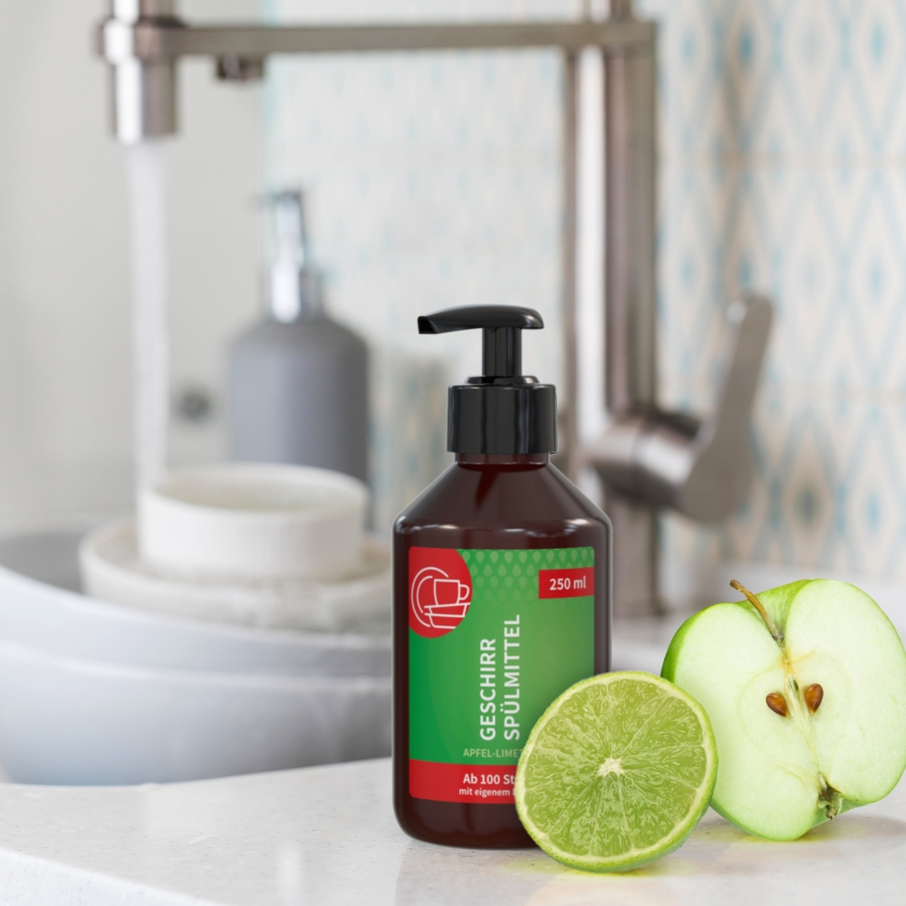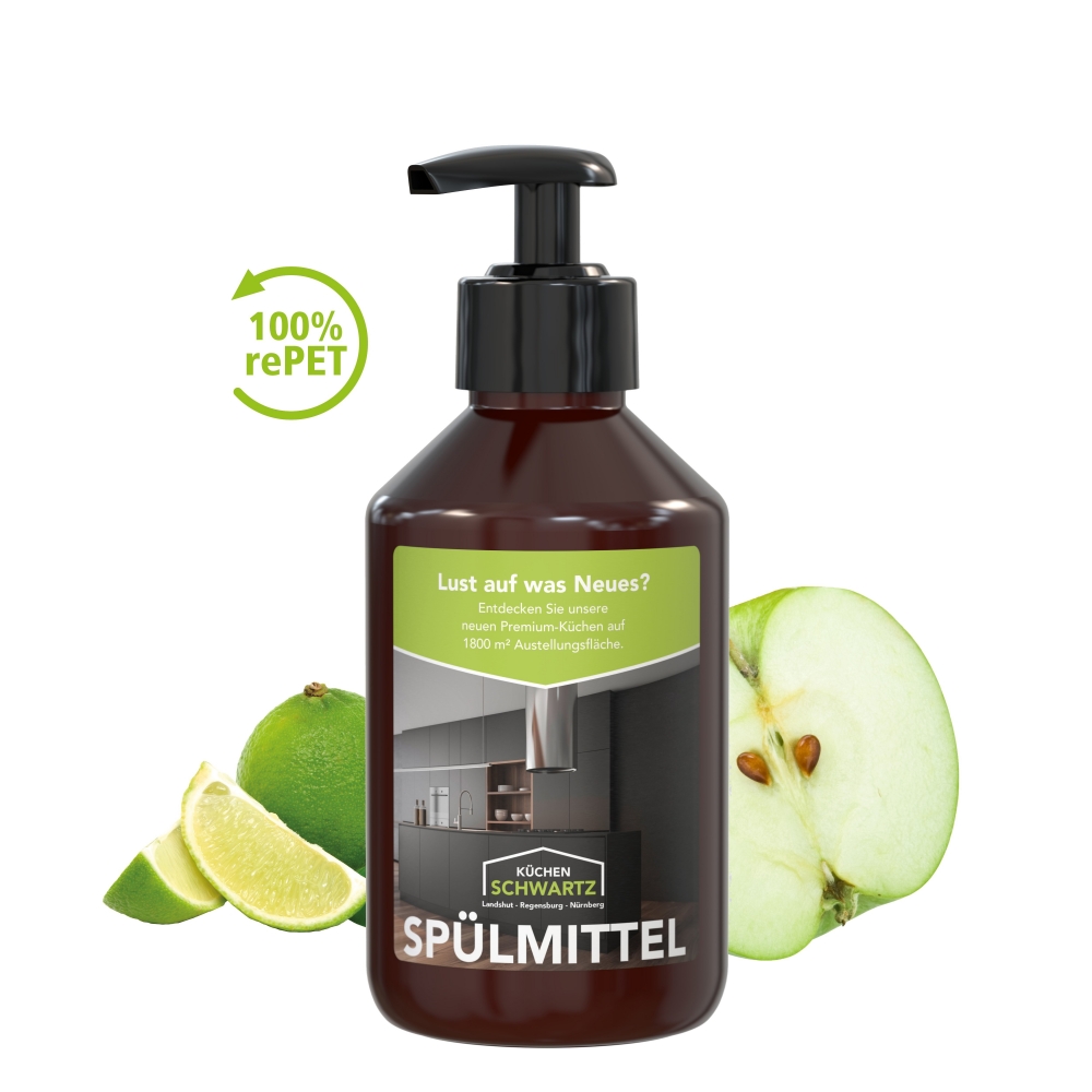 Artikel-Nr: SAN20-232-265-100Hand-Geschirrspülmittel, 250 ml Pumpspender Braune Flasche, hergestellt aus 100% recyceltem PET, mit schwarzer Pumpe. Nachfüllbar. Spülmittel in Profi-Gastro-Qualität mit Duft nach Apfel-Limette: Extra starke Reinigungskraft mit Aktiv-Fettlöseformel neuester Generation. Es entfernt dank höchster Spülleistung Fett und Speisereste im Handumdrehen, ist gut abspülbar und funktioniert sogar mit kaltem Wasser. Das Spülmittel ist vegan, frei von Parabenen, Silikonen und Mikroplastik. •Komplexes Tensid-System, biologisch abbaubar •Mit nachwachsenden Rohstoffen •Gut abspülbar bei höchster Spülleistung •Hergestellt in Deutschland •pH hautfreundlich Sparsam im Gebrauch: 3 ml sind ausreichend für 10 l Wasser. Dermatologisch getestet "Sehr gut hautverträglich". Hergestellt in Deutschland. Dekoration: Body Label: Mattes Etikett (weiß) auf Vorder- und Rückseite, Druck 4c CMYK. Füllung: 250 ml