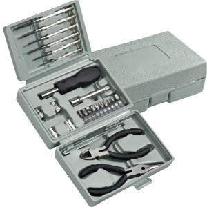 Artikel-Nr: EAG800207Werkzeugset bestehend aus diversen Schraubendrehern, einer Pinzette, zwei Zangen und einem Schraubendreher mit verschiedenen Nüssen und Bits. Ihre Werbung gravieren wir auf den Deckel des Werkzeugsets. Doming auf Anfrage.