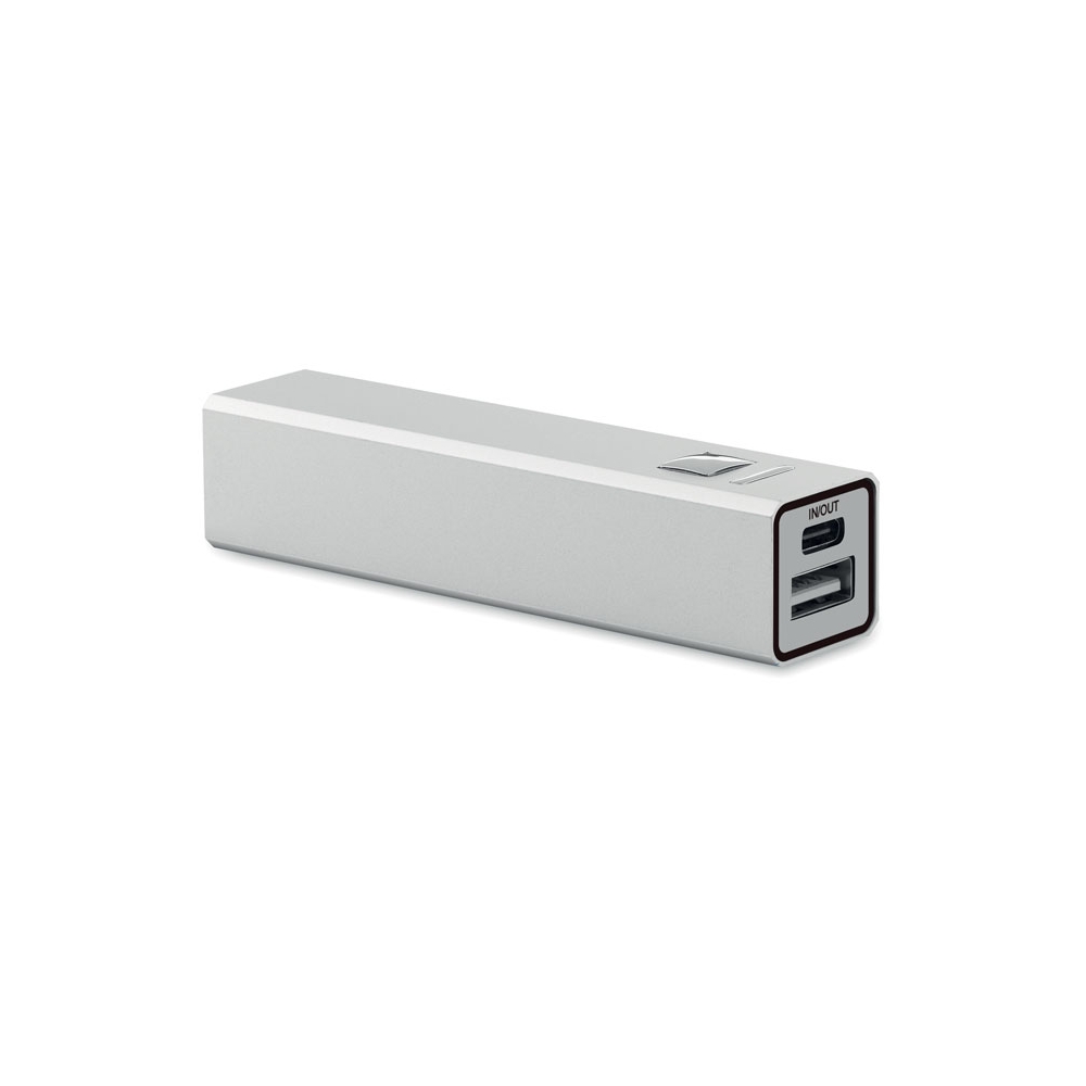 Artikel-Nr: OCBMO2374-16Powerbank 2600 mAh aus recyceltem Aluminium. Geeignet zum Betrieb von Smartphones. Ausgangsstrom DC5V/2A. Inkl. USB-Typ-C Ladekabel mit Typ-A Adapter. Eingang / Ausgang: USB-Typ-C.