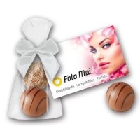 Verpackung: In Glanzbeutel mit roter oder weißer Satinschleife und bedruckter Karte aufgebunden.