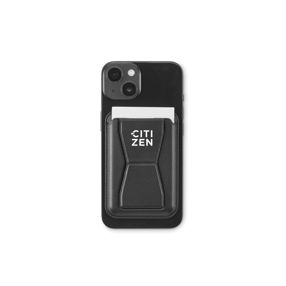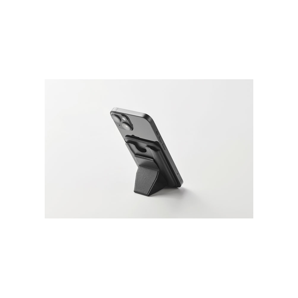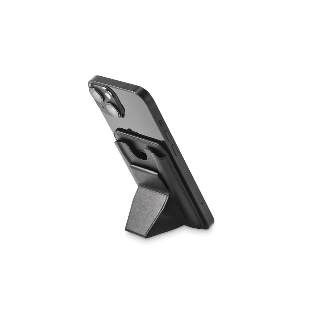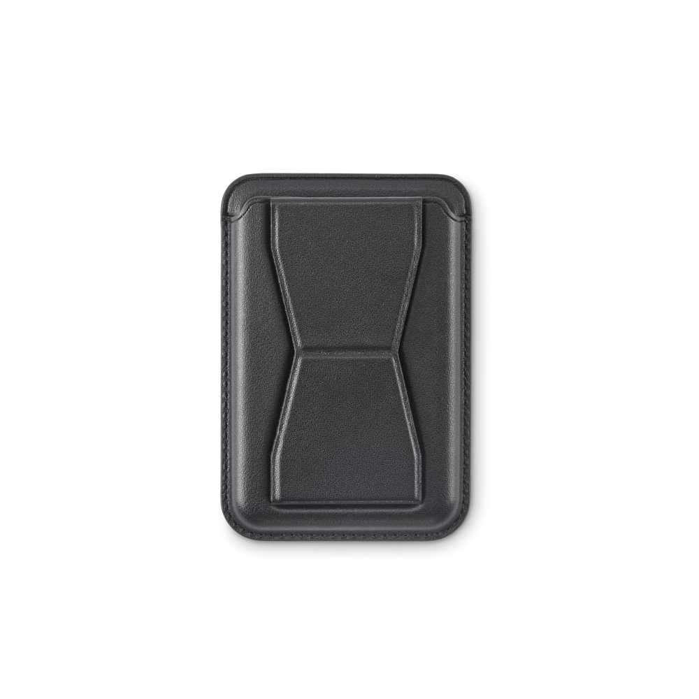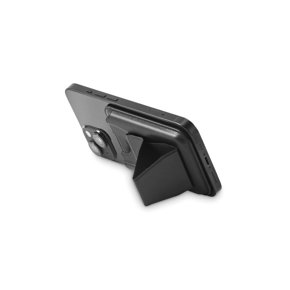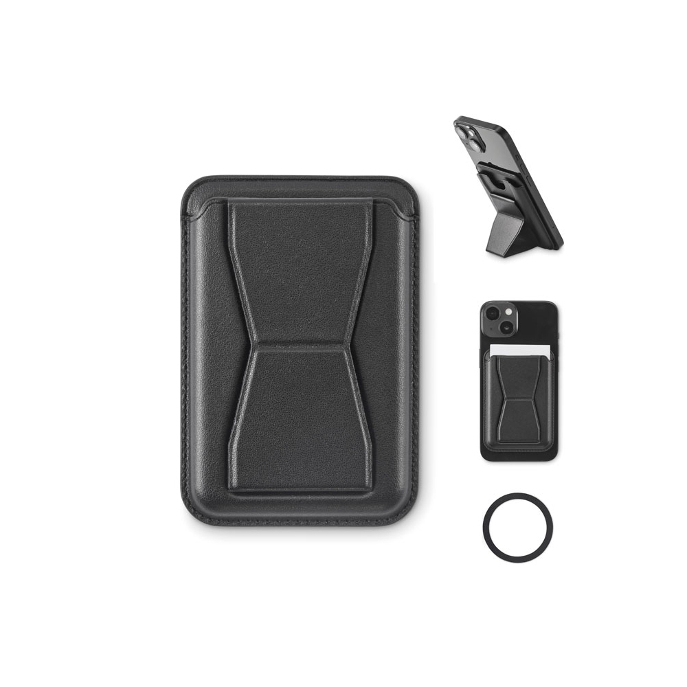 Artikel-Nr: OCBMO2654-03Ausklappbarer Smartphone-Halter mit Kartenfach (2 Karten). PU. Standfunktion, Magnetverschluss. Kompatibel mit iPhone® 12 und neueren Modellen. Inkl. magnetischem Metallring, um das Aufladen anderer nicht-magnetischer, kabellos aufladbarer Smartphones zu unterstützen.