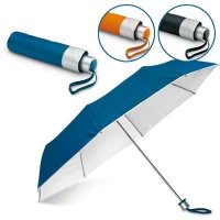 3-fach faltbarer Mini-Regenschirm mit silbernen Innennähten. Hülle in passender Farbe. 8 Segmente, 190T Polyester. Abmessung: Ø 97 x 57 cm. Druckgröße: 100 x 50 mm. Erhältlich in den abgebildeten Farben.