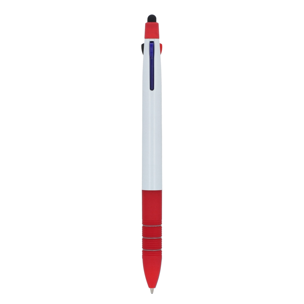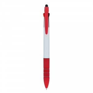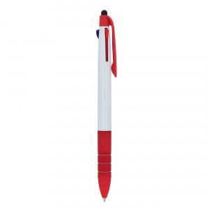 Artikel-Nr: ART87852N01213-farbiger Kugelschreiber mit Stylus und weichem Ergogriff. Die Schreibfarben sind Schwarz, Blau und Rot.