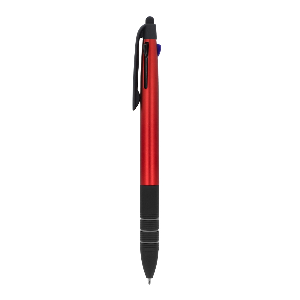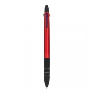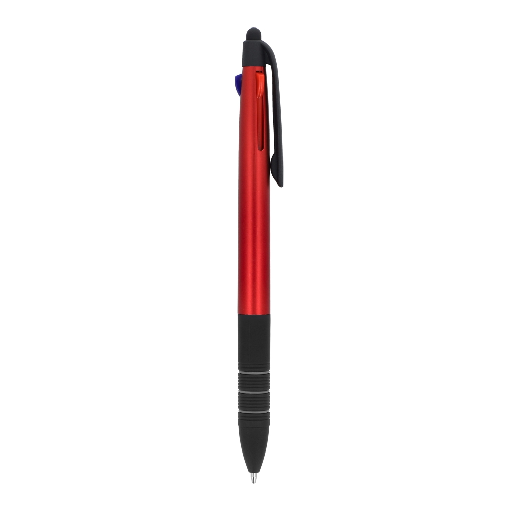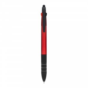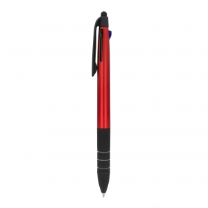 Artikel-Nr: ART87853N00213-farbiger Metallic-Kugelschreiber mit Stylus und weichem Ergogriff. Die Schreibfarben sind Schwarz, Blau und Rot.