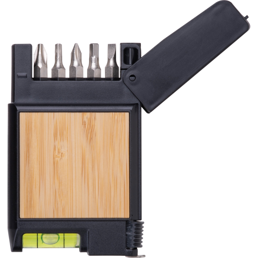 Artikel-Nr: EAG5452033 Meter Maßband aus Kunststoff mit Wasserwaage, Feststelltaste und fünf verschiedenen Bits. Ihre Werbung bringen wir auf dem Bambusinlay an.