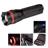 Artikel-Nr: 57371030SW-RO3 Watt CREE LED Leuchte mit Fokussierung und Signalfunktion. Die hochwertige wassergeschützte Taschenleuchte aus Aluminium liefert mit ihren leuchtstarken120 Lumen helles Licht in jede Dunkelheit. Der im eingeschalteten Modus rundum leuchtende rote Ring aus ABS dient als Sicherheitslicht mit Signalfunktion und kann mit Hilfe des integrierten Magneten an der Unterseite der Leuchte im Pannenfall am KFZ angebracht werden. Durch den fluoreszierenden ON / OFF Schalter ist die Leuchte auch bei Dunkelheit jederzeit auffindbar. Die CREE LED Typ XR-E Q3 kann in drei verschiedene Leucht-Modi geschalten werden: 100%, 50% sowie eine Signalfunktion. Durch Drehen des Leuchtenkopfes kann derLichtstrahl fokussiert werden. Brenndauer bei 100% Leuchtfunktion bis zu 5,5 Std. möglich. 3 AAA Markenbatterien und hochwertige Karton-Geschenkverpackung mit Magnetverschluss inkl.