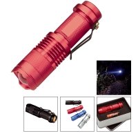 Artikel-Nr: 57371025RO-003 Watt CREE LED Leuchte mit Fokussierung und Signalfunktion. Technisches Design gepaart mit 110 Lumen starker Leuchtkraft werden auch Sie überzeugen. Das hochwertig verarbeitete wassergeschützte high-end Aluminiumgehäuse verfügt über eine beidseitige Gravurfläche für die Werbeanbringung. Der robuste Clip an der Leuchte dient zur Befestigung z.B. am Gürtel und löst dazu ein banales Problem, dass die Leuchte z.B. nicht mehr vom Tisch rollen kann. Die CREE LED Typ XP-E R3 kann in drei verschiedene Leucht-Modi geschalten werden: 100%, 50% sowie eine Signalfunktion. Durch Herausziehen des Leuchtenkopfes kann der Lichtstrahl fokussiert werden. Brenndauer bei 100% Leuchtfunktion bis zu 2 Stunden möglich. 1 AA Markenbatterie und attraktive Metalldose inkl.