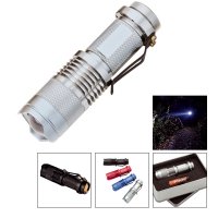 Artikel-Nr: 57371025SI-003 Watt CREE LED Leuchte mit Fokussierung und Signalfunktion. Technisches Design gepaart mit 110 Lumen starker Leuchtkraft werden auch Sie überzeugen. Das hochwertig verarbeitete wassergeschützte high-end Aluminiumgehäuse verfügt über eine beidseitige Gravurfläche für die Werbeanbringung. Der robuste Clip an der Leuchte dient zur Befestigung z.B. am Gürtel und löst dazu ein banales Problem, dass die Leuchte z.B. nicht mehr vom Tisch rollen kann. Die CREE LED Typ XP-E R3 kann in drei verschiedene Leucht-Modi geschalten werden: 100%, 50% sowie eine Signalfunktion. Durch Herausziehen des Leuchtenkopfes kann der Lichtstrahl fokussiert werden. Brenndauer bei 100% Leuchtfunktion bis zu 2 Stunden möglich. 1 AA Markenbatterie und attraktive Metalldose inkl.