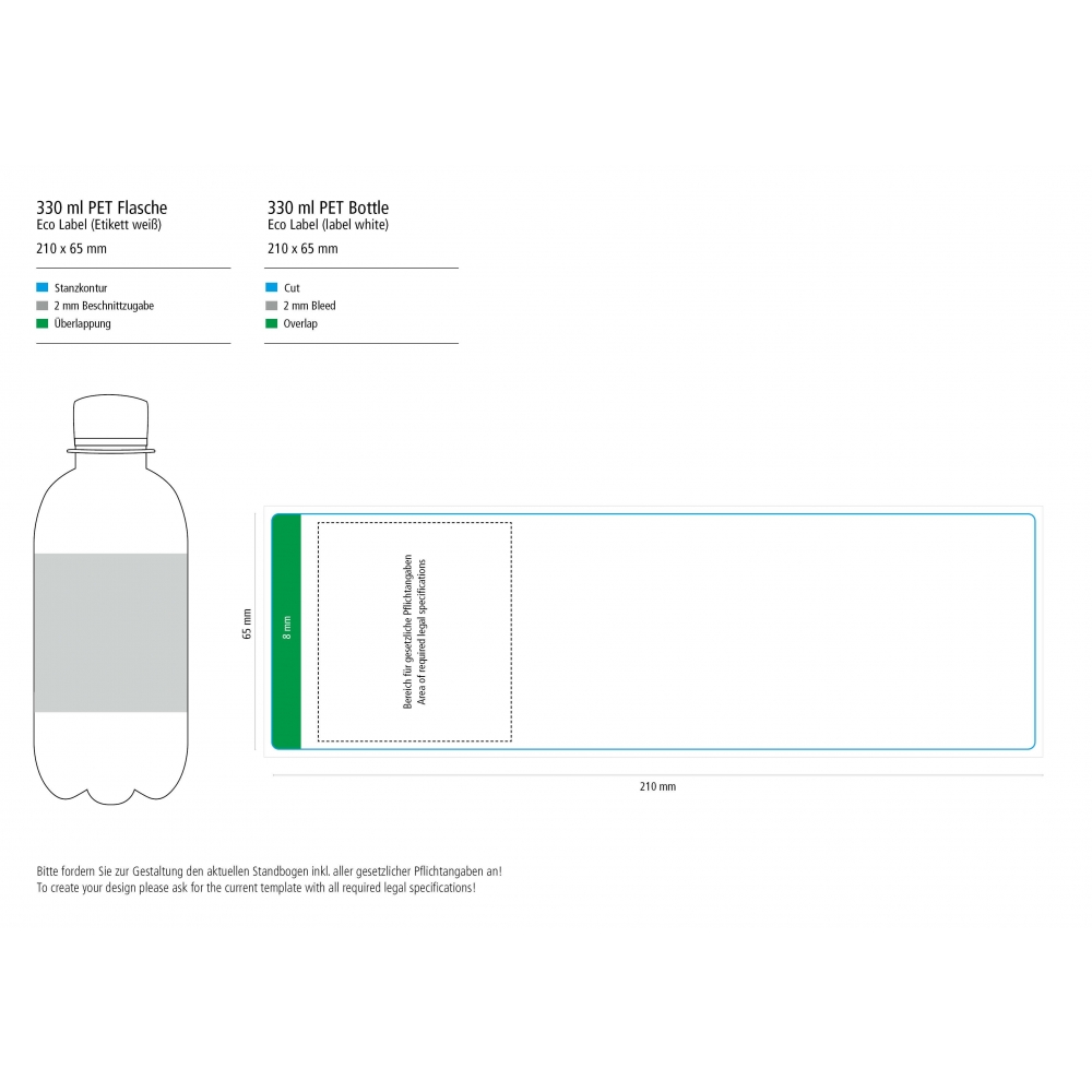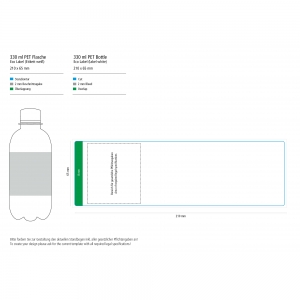 Artikel-Nr: SAN10-152-171-110Wasser 330 ml PET Flasche aus 100% recyceltem PET (Recyclat) mit Schraubverschluss. Wasser mit Werbewasser - der Allrounder für erfrischendes Marketing! Durch seine einmalige Zusammensetzung ist es ideal für einen erfrischenden Werbeauftritt auf Messen, Incentives, Tagungen oder Outdoor-Events. • Regionale Abfüllung • Naturfrisches Wasser • Ausgewogene Zusammensetzung • Geschmacksneutral Dekoration: Eco Label: Etikettierung rundum. Weißes, holzfreies, ungestrichenes Papieretikett, hergestellt zu 100% aus zertifizierten Recyclingfasern (PCR) mit offener und natürlicher Oberflächenstruktur. Matt-stumpf ohne Glanz für ein besonders natürliches Aussehen. Umweltfreundlich ohne Lack. Feuchtigkeitsfest. Druck: 4c (CMYK) Zuzüglich 0,25 Euro Pfand bei Einsatz in Deutschland oder Österreich. Erstattung an den bekannten Rückgabestellen oder Automaten. Füllung: 330 ml Nicht in die Niederlande und nach Dänemark lieferbar.