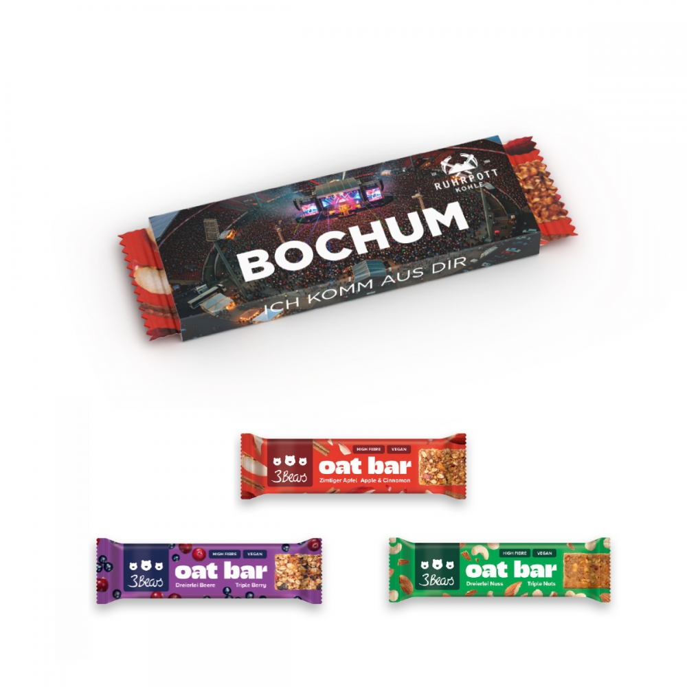 Artikel-Nr: MGN08023-0002Die leckeren 3Bears Riegel sind der ideale Snack für zwischendurch – ob im Büro, im Kindergarten oder im Gym, sie passen perfekt in jede Tasche. Erhältlich in drei köstlichen Sorten, die einfach Lust auf mehr machen. Alle Riegel sind vegan, ballaststoffreich, ohne Industriezucker und palmölfrei. Für bewussten Genuss mit gutem Gefühl. Verpackt in einem individuell veredelbaren Werbeschuber aus FSC®-zertifiziertem Papier.