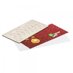 Artikel-Nr: HOP21.31952.00Vom Kunden zusammengesetzt, entstehen kleine, dreidimensionale Kunstwerke für jeden Lieblingsplatz. Das Gesamtprodukt umfasst die gelaserte Echtholzplatte mit eingelegten Filzteilen und die individuell gestaltete DIN lang Weihnachtskarte. Versandfertig verpackt im mitgelieferten weißen Briefumschlag wird das 3D Holzpuzzle zum optimalen Printmailing für die Weihnachtsgrüße. Zur Auswahl stehen die Motive Tannenbaum und Schneemann sowie die Holz-Filz Tanne. Eine zusätzliche Lasergravur auf der Holzkarte ist möglich.