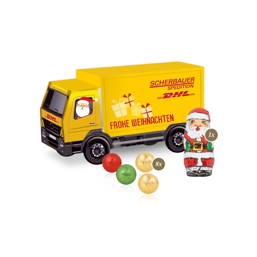 Artikel-Nr: CDL95540Beliebtes Firmenpräsent zum attraktiven Preis! Die beliebten 3D-Modelle "LKW" oder "Transporter" sind individuell in Ihrem Firmendesign bedruckbar. Eine Füllung mit feinster Markenschokolade sorgt für himmlische Genussmomente. Dieses Firmenpräsent findet bestimmt einen Ehrenplatz in den Büros Ihrer Kunden und Mitarbeiter