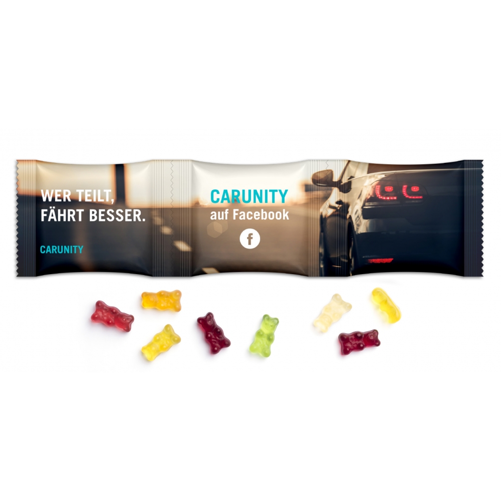 Artikel-Nr: MGN01009-0005Gemischte Gummibärchen im 3er Werbetütchen (à 5 g) verbunden durch eine Perforationsnaht zum Abtrennen – ideal zum Teilen oder Portionieren.