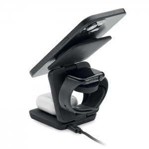 Artikel-Nr: OCBMO2521-033in1 faltbare Ladestation. Gummiertes, recyceltes ABS. Inkl. kabelloses Ladegerät 15 W, Smartwatch-Ladegerät (nur Apple®) sowie TWS-Ladegerät.