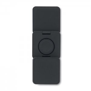 Artikel-Nr: OCBMO2521-033in1 faltbare Ladestation. Gummiertes, recyceltes ABS. Inkl. kabelloses Ladegerät 15 W, Smartwatch-Ladegerät (nur Apple®) sowie TWS-Ladegerät.