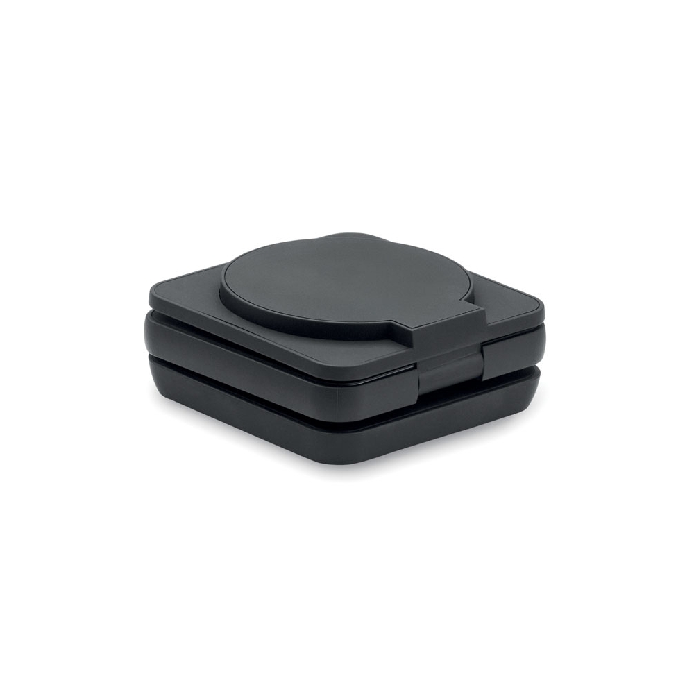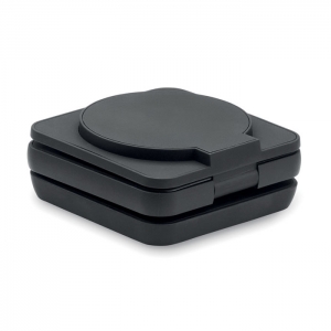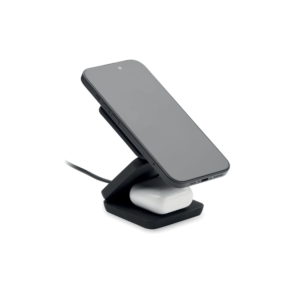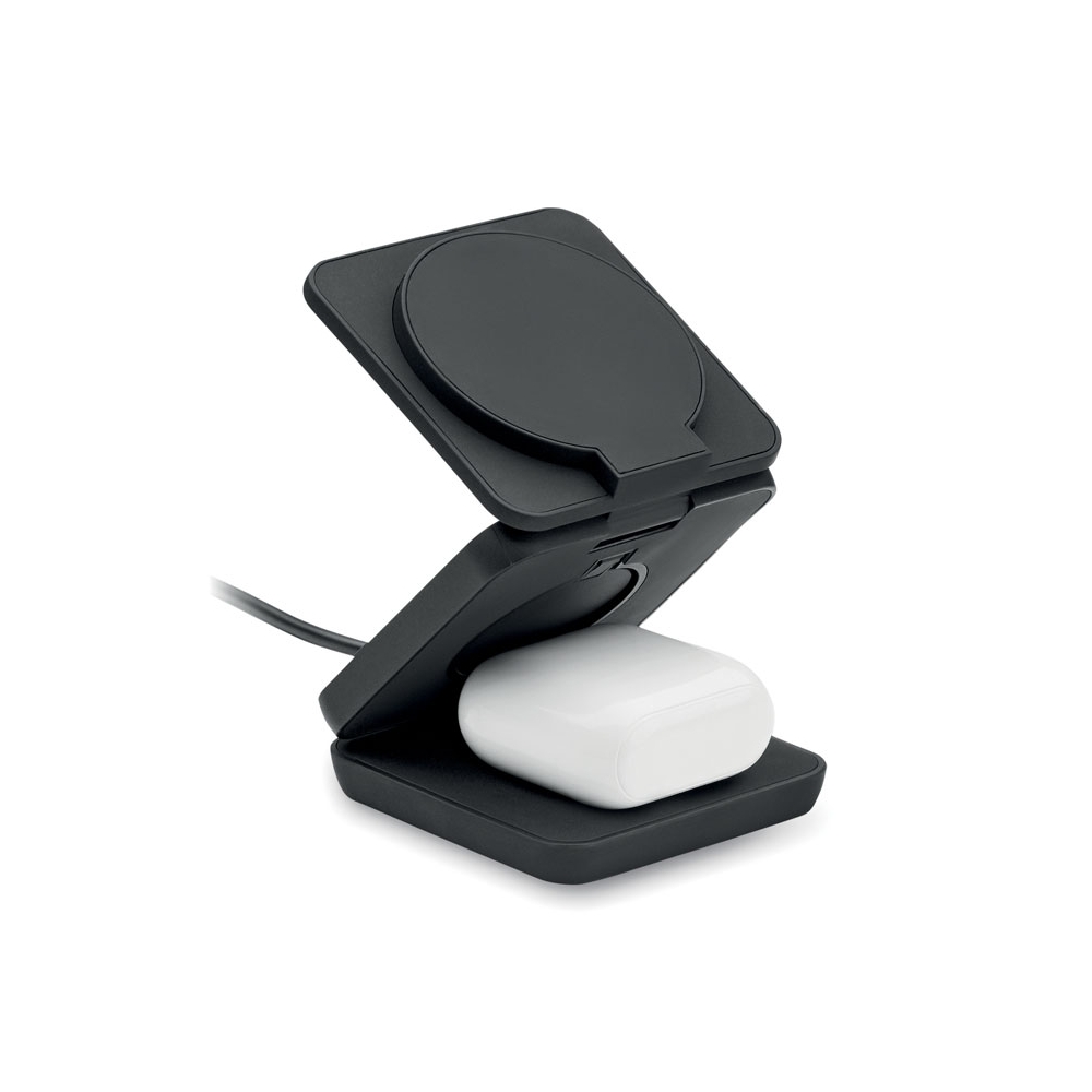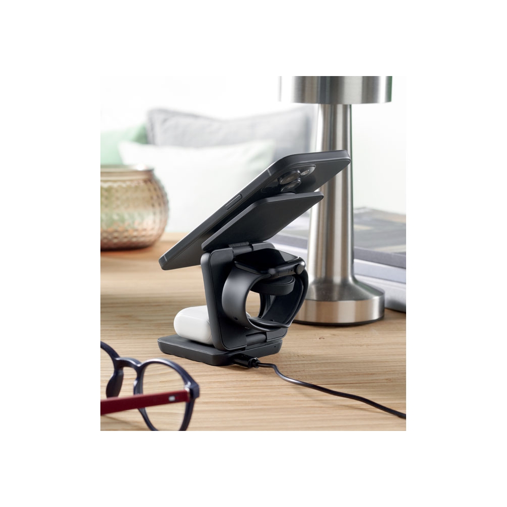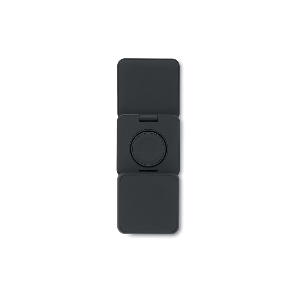 Artikel-Nr: OCBMO2521-033in1 faltbare Ladestation. Gummiertes, recyceltes ABS. Inkl. kabelloses Ladegerät 15 W, Smartwatch-Ladegerät (nur Apple®) sowie TWS-Ladegerät.