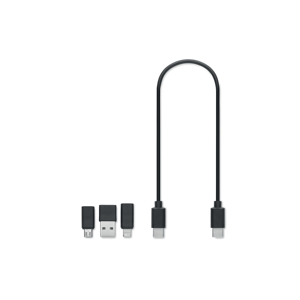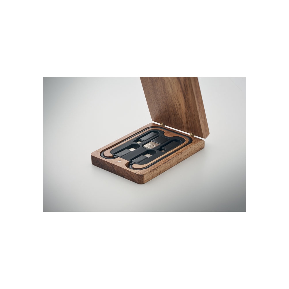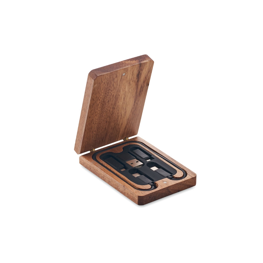 Artikel-Nr: OCBMO2150-403in1 Ladekabel-Set mit verschiedenen Anschlüssen. Typ-C auf Typ-C-Kabel, C auf USB-A, C auf Mikro-B, C auf Lightning-Anschlüsse. Lieferung in Box aus Akazienholz.