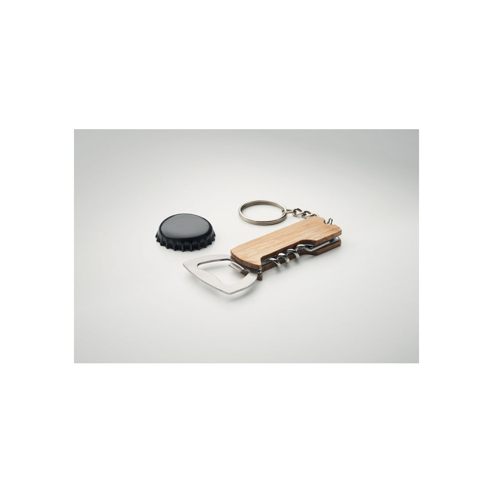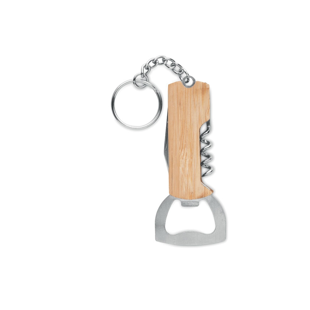Artikel-Nr: OCBMO2212-403in1 Multifunktionstool mit Griffteil aus Bambus und Schlüsselring. Inkl. Kapselheber, Korkenzieher und Taschenmesser.