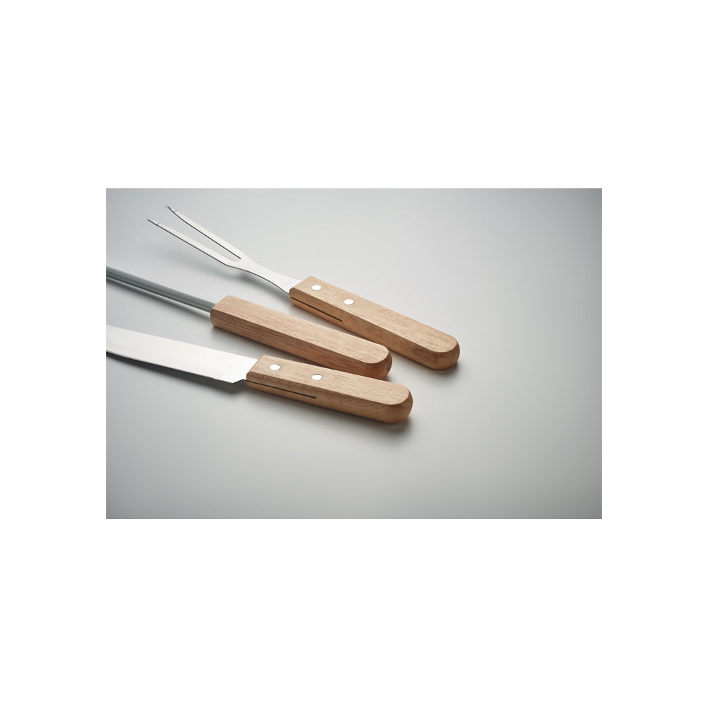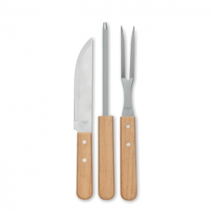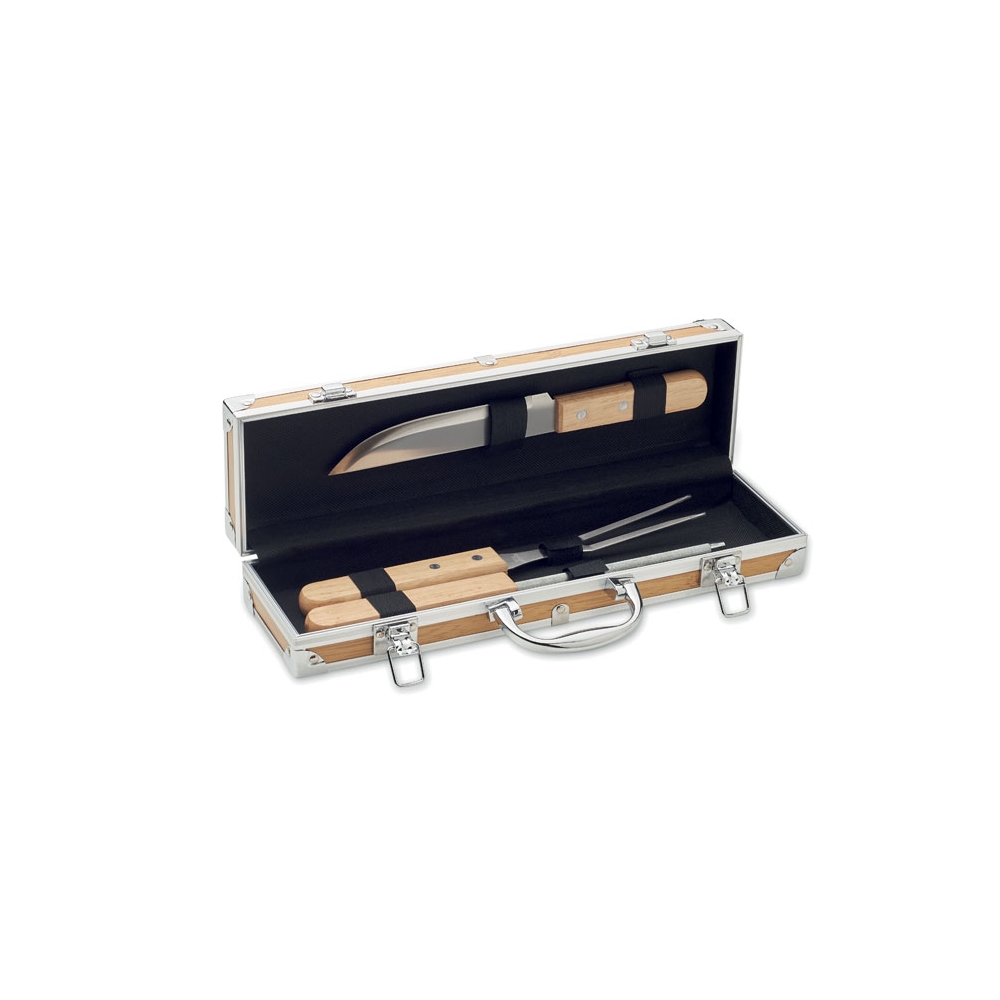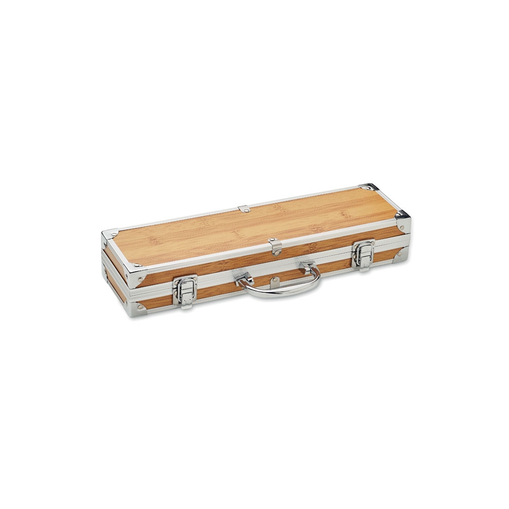 Artikel-Nr: OCBMO2471-403teiliges BBQ-Set mit Messer, Grillgabel und Messerschärfer. Edelstahl mit Griffen aus Holz. Lieferung im Koffer aus Aluminium in Holzoptik.