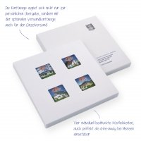 Artikel-Nr: 4946065Bis zu vier unterschiedliche Botschaften transportiert dieses Präsent auf köstliche Art und Weise. Durch die Sichtfenster fallen die Motive auf den M-Plätzchen bzw. -Pralinen sofort ins Auge. Ob als Einladung (optional auch mit Versandhülle erhältlich) oder direkt als Messepräsent zur Veranstaltung – mit diesem Präsent liegen Sie garantiert richtig.