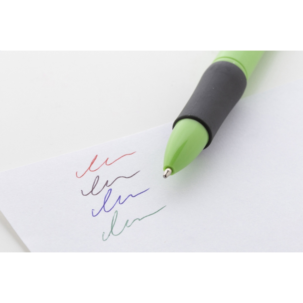 Artikel-Nr: AND800140-07Vierfarbkugelschreiber aus recyceltem ABS mit Gummigriffzone. Minen schwarz-, blau-, rot- und grünschreibend.