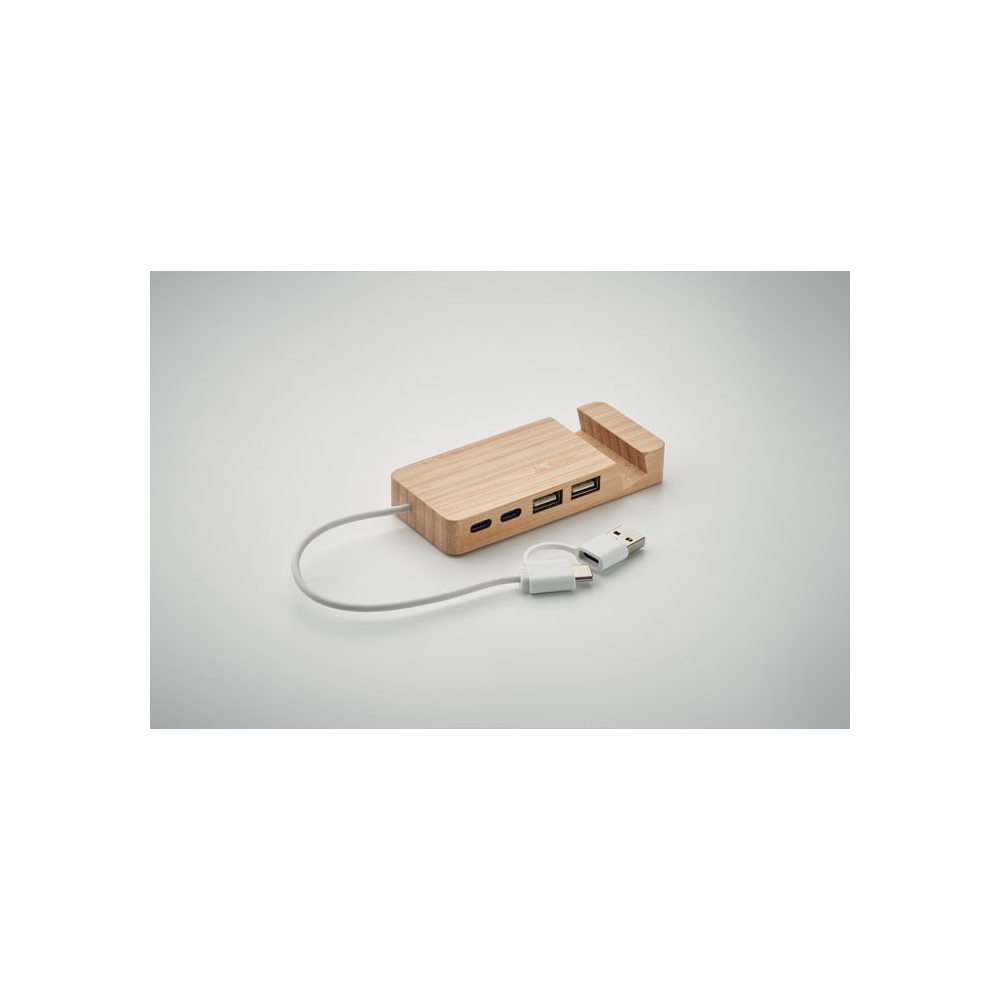 Artikel-Nr: OCBMO2144-404 Ports USB-C / A-Hub im Gehäuse aus Bambus. Ausgang: 2 x Typ-A und 2 x Typ-C. Eingang: 2-in-1 Typ-C & Typ-A. Kabellänge: 20 cm.