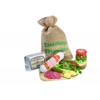 4-teiliges Set bestehend aus Salami, Bördespeck, Gewürzgurken und Pumpernickel im Jutesäckchen verpackt