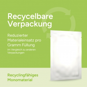 Artikel-Nr: SAN20-266-282-370Abwehrkräftebad, 40 ml Sachet (recyclingfähig) "Soft Touch" Badezusatz zur Unterstützung der Abwehrkräfte. Geeignet für Erwachsene und Kinder ab 3 Jahren. Angereichert mit natürlichen Ölen von Eukalyptus, Thymian und Fenchel ist das Abwehrkräfte-Bad ideal für die Erkältungszeit. Es hilft, die Atemwege zu öffnen und entfaltet seine befreiende Wirkung besonders bei nasskaltem Herbst- und Winterwetter. Es steigert das allgemeine Wohlbefinden und schenkt Wärme und Entspannung für Körper und Geist. Honig, Sonnenblumenöl, Allantoin und hydrolysiertes Weizenprotein pflegen die Haut und lassen sie nicht austrocknen. Die Rezeptur enthält über 97% Inhaltsstoffe natürlichen Ursprungs, einschließlich Wasser, und verzichtet auf Mikroplastik, Silikone, Mineralöle, PEGs und SLES. • Natürliches Eukalyptusöl • Natürliches Thymianöl • Natürliches Fenchelöl • Ohne Konservierungsstoffe • Dermatologisch getestet "Sehr gut hautverträglich" • Hergestellt in Deutschland Füllmenge: 40 ml für 1 Vollbad (1 Anwendung) Kein Materialmix wie bei herkömmlichen Sachets: Es wird aus Mono-PP hergestellt und ist recyclingfähig ("Made for Recycling" 18 / 20 Punkten). Oberfläche matt mit Soft Touch Veredelung. Druck auf das Sachet: 4c (CMYK) mit matter Soft-Touch-Oberfläche