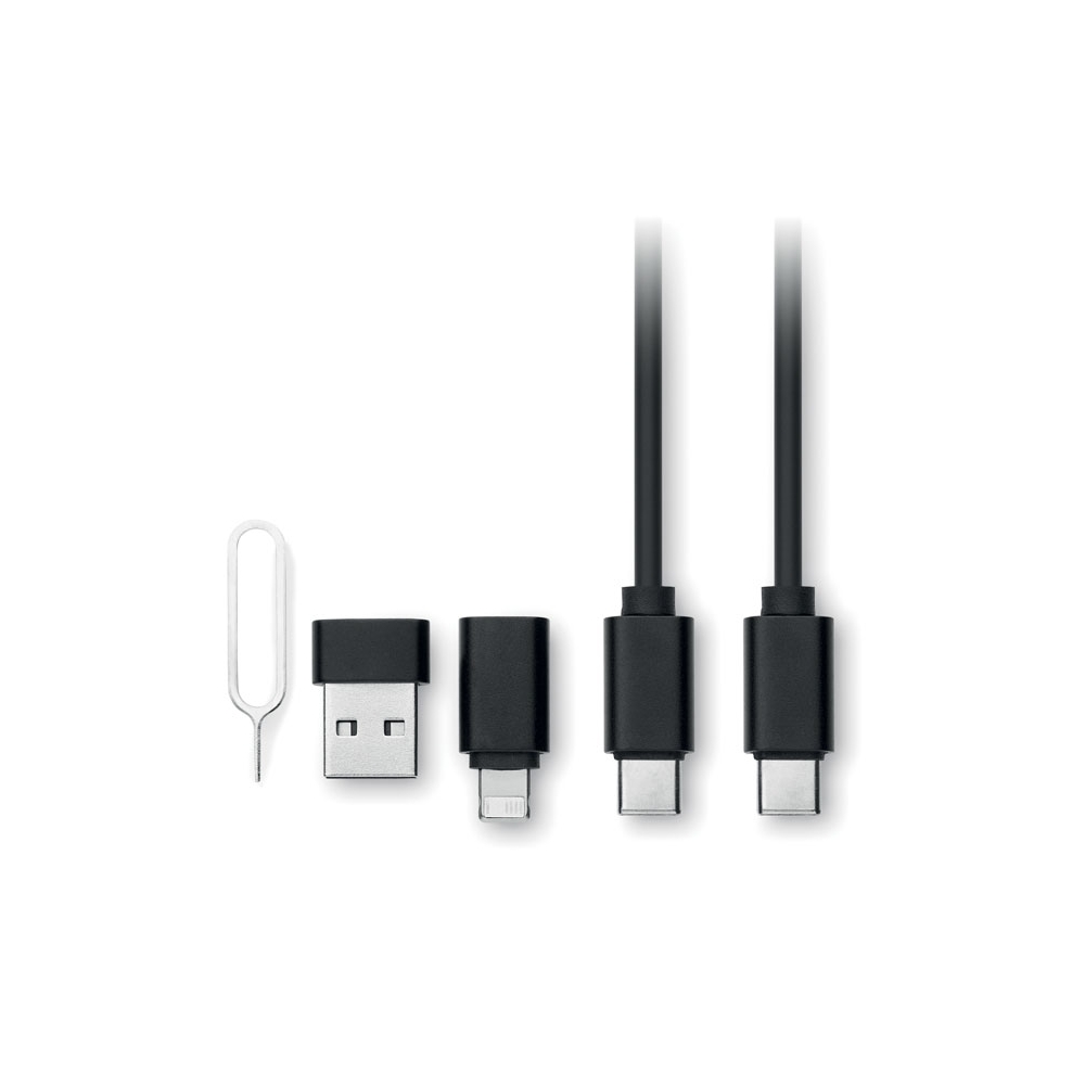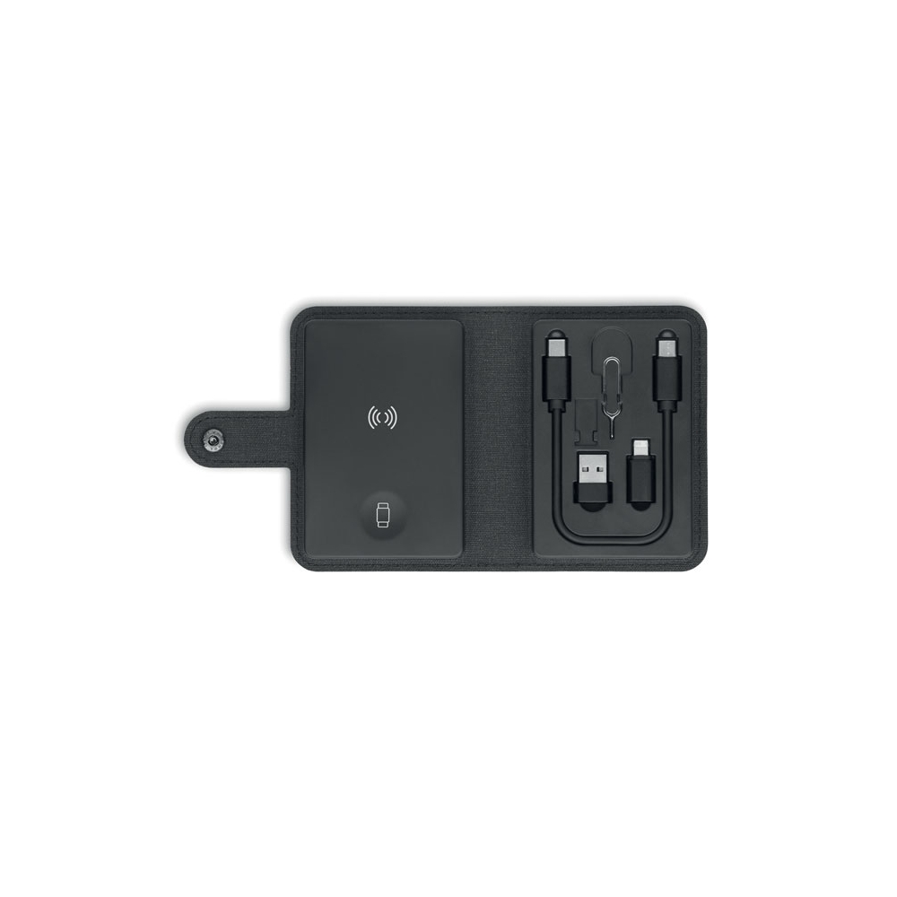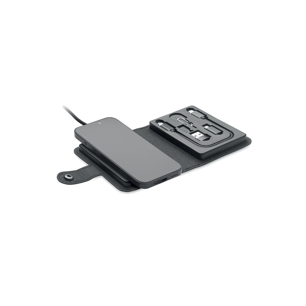 Artikel-Nr: OCBMO2530-03Kabel-Set mit kabelloser Ladestation 15W und Smartwatch-Ladegerät (nur Apple®). 4in1 Ladekabel und Auswurftool. Cover aus recyceltem PU und RPET, recyceltes ABS und Platte aus recyceltem Aluminium.