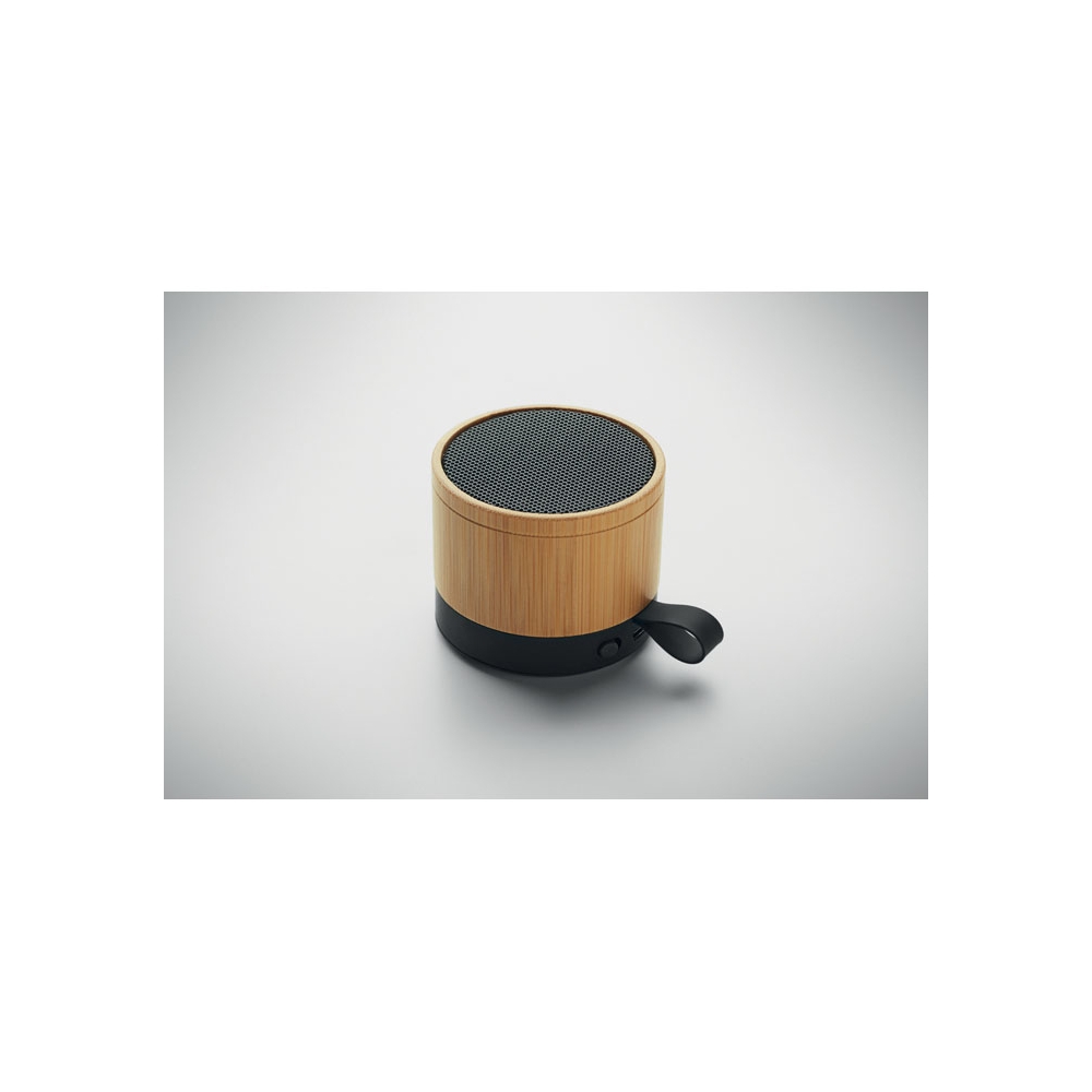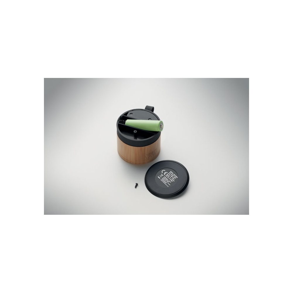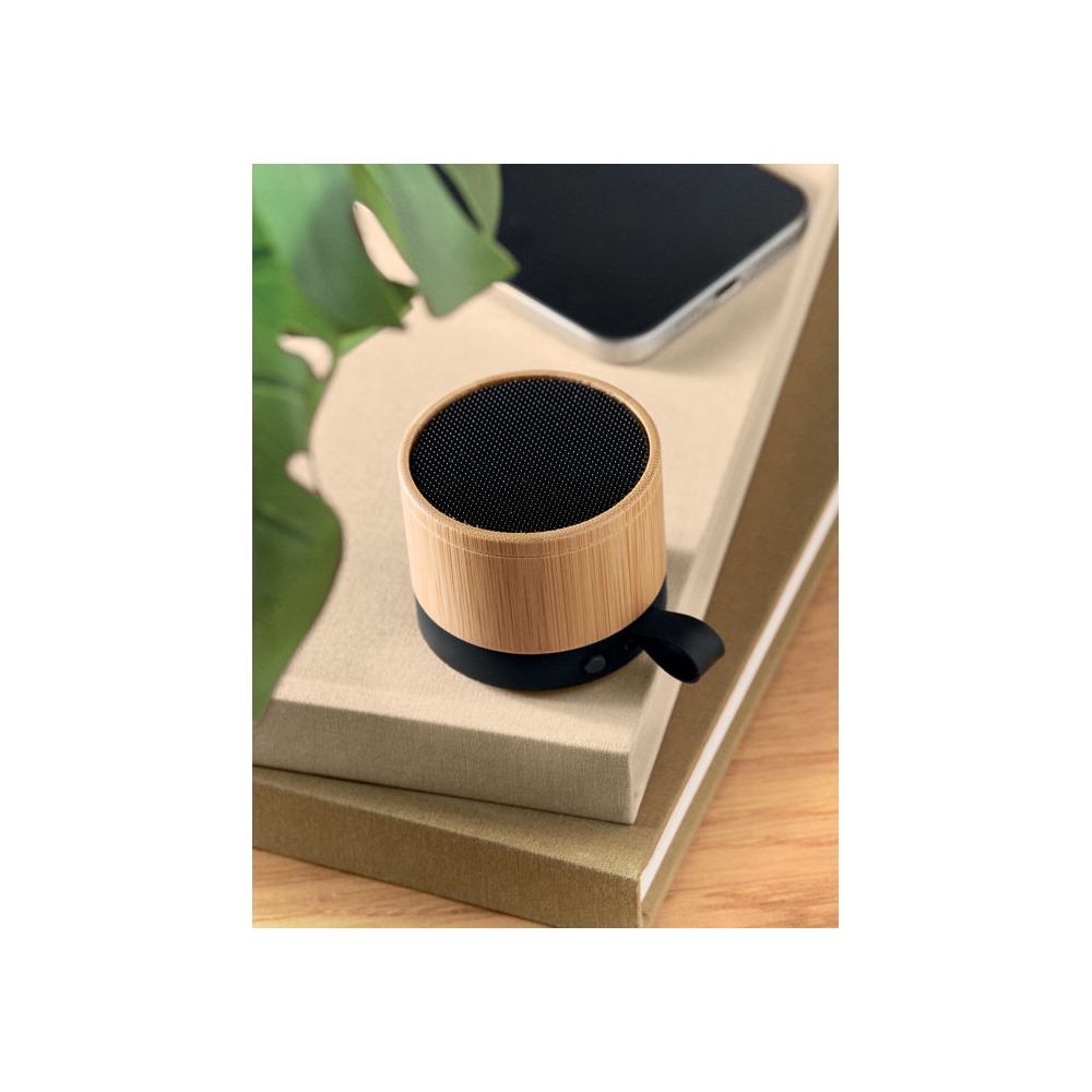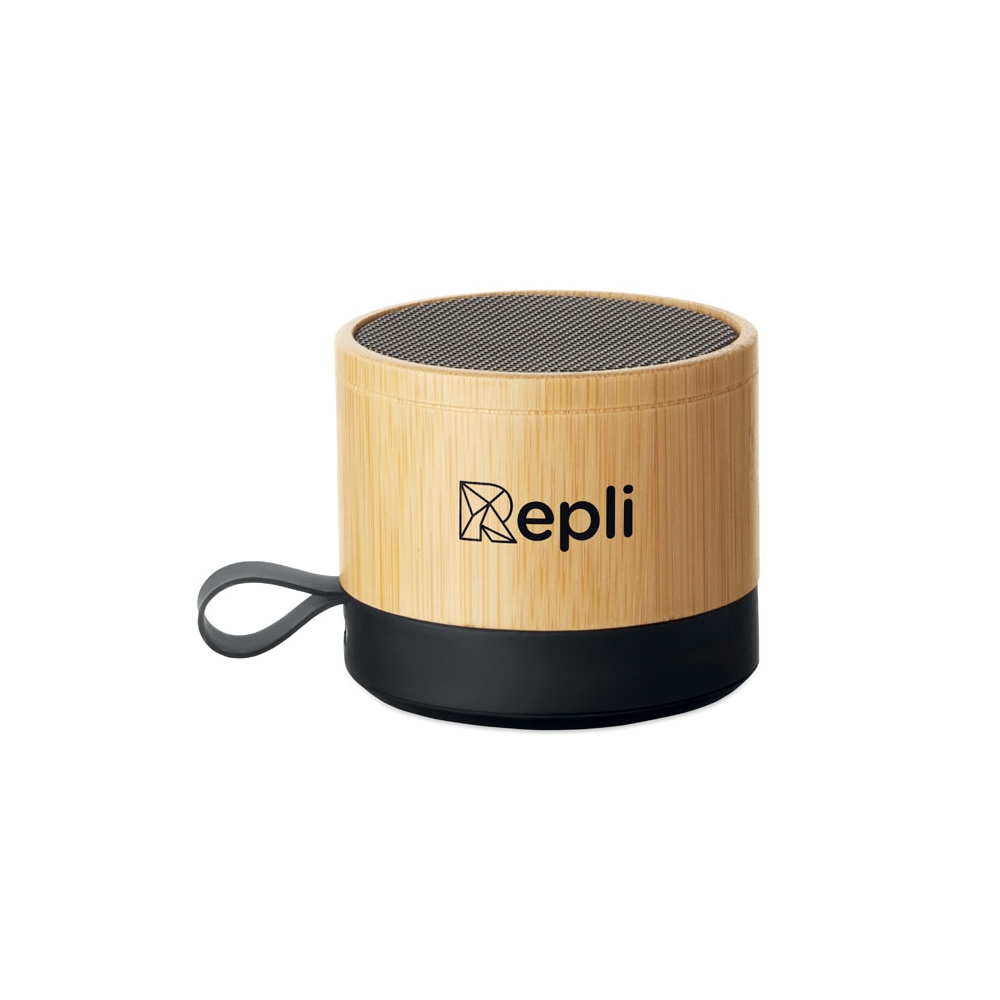 Artikel-Nr: OCBMO2801-405.1 wireless Lautsprecher. ABS Sockel und Bambusgehäuse. Kompaktes, modernes Design. 3W Mono-Sound. Inkl. wiederaufladbarem und austauschbarem 500mAh-Akku.