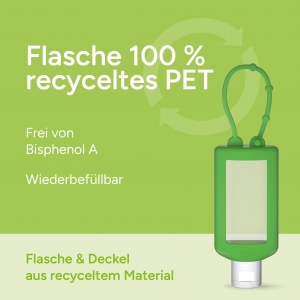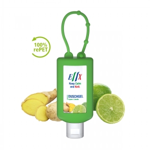 Artikel-Nr: SAN20-312-240-100Praktische Kosmetikflasche zum Anhängen! Das Fläschchen mit Silikonhülle ist nicht nur optisch ein echter Hingucker! Raffiniert mit Schlaufe zum Anhängen an den Rucksack, an die Sporttasche, an den Kinderwagen oder natürlich im Bad unter der Dusche. 50 ml Flasche aus 100% recyceltem PET, transparent mit leichter R-PET-Färbung. Mit Klappdeckel "weiß" aus recyceltem PP, zufällig ausgerichtet; Silikonhülle und Schlaufe in Nachfüllbar. Das Body & Hair Duschgel mit dem Mix aus Ingwer und Limette sorgt mit seinem spritzigen Duft für Frische über den ganzen Tag und macht das Duschen zum Erlebnis! Es entsteht ein angenehmer Schaum, der Haut und Haare reinigt und zugleich pflegt. • Vegan • pH-hautneutral • Ohne Parabene • Ohne Konservierungsstoffe • Dermatologisch getestet "Sehr gut hautverträglich" • Hergestellt in Deutschland Dekoration: Body Label: Etikett PE (weiß) auf Vorder- und Rückseite, Druck 4c CMYK. Wahlweise glänzend oder matt. Füllung: 50ml