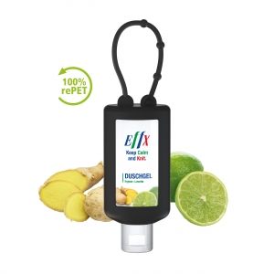Artikel-Nr: SAN20-314-240-100Praktische Kosmetikflasche zum Anhängen! Das Fläschchen mit Silikonhülle ist nicht nur optisch ein echter Hingucker! Raffiniert mit Schlaufe zum Anhängen an den Rucksack, an die Sporttasche, an den Kinderwagen oder natürlich im Bad unter der Dusche. 50 ml Flasche aus 100% recyceltem PET, transparent mit leichter R-PET-Färbung. Mit Klappdeckel "weiß" aus recyceltem PP, zufällig ausgerichtet; Silikonhülle und Schlaufe in Nachfüllbar. Das Body & Hair Duschgel mit dem Mix aus Ingwer und Limette sorgt mit seinem spritzigen Duft für Frische über den ganzen Tag und macht das Duschen zum Erlebnis! Es entsteht ein angenehmer Schaum, der Haut und Haare reinigt und zugleich pflegt. • Vegan • pH-hautneutral • Ohne Parabene • Ohne Konservierungsstoffe • Dermatologisch getestet "Sehr gut hautverträglich" • Hergestellt in Deutschland Dekoration: Body Label: Etikett PE (weiß) auf Vorder- und Rückseite, Druck 4c CMYK. Wahlweise glänzend oder matt. Füllung: 50ml