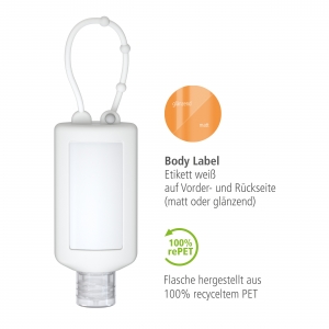 Artikel-Nr: SAN20-313-240-100Praktische Kosmetikflasche zum Anhängen! Das Fläschchen mit Silikonhülle ist nicht nur optisch ein echter Hingucker! Raffiniert mit Schlaufe zum Anhängen an den Rucksack, an die Sporttasche, an den Kinderwagen oder natürlich im Bad unter der Dusche. 50 ml Flasche aus 100% recyceltem PET, transparent mit leichter R-PET-Färbung. Mit Klappdeckel "weiß" aus recyceltem PP, zufällig ausgerichtet; Silikonhülle und Schlaufe in Nachfüllbar. Das Body & Hair Duschgel mit dem Mix aus Ingwer und Limette sorgt mit seinem spritzigen Duft für Frische über den ganzen Tag und macht das Duschen zum Erlebnis! Es entsteht ein angenehmer Schaum, der Haut und Haare reinigt und zugleich pflegt. • Vegan • pH-hautneutral • Ohne Parabene • Ohne Konservierungsstoffe • Dermatologisch getestet "Sehr gut hautverträglich" • Hergestellt in Deutschland Dekoration: Body Label: Etikett PE (weiß) auf Vorder- und Rückseite, Druck 4c CMYK. Wahlweise glänzend oder matt. Füllung: 50ml