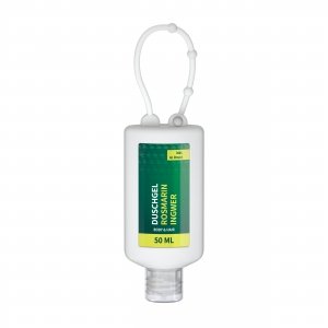 Artikel-Nr: SAN20-313-241-100Praktische Kosmetikflasche zum Anhängen! Das Fläschchen mit Silikonhülle ist nicht nur optisch ein echter Hingucker! Raffiniert mit Schlaufe zum Anhängen an den Rucksack, an die Sporttasche, an den Kinderwagen oder natürlich im Bad unter der Dusche. 50 ml Flasche aus 100% recyceltem PET, transparent mit leichter R-PET-Färbung. Mit Klappdeckel "weiß" aus recyceltem PP, zufällig ausgerichtet; Silikonhülle und Schlaufe in Nachfüllbar. Das Body & Hair Duschgel mit dem Mix aus Rosmarin und Ingwer regt mit seinem umwerfend würzig-frischen Duft die Sinne an und macht das Duschen zum Erlebnis! Es entsteht ein angenehmer Schaum, der Haut und Haare reinigt und zugleich pflegt. • Vegan • pH-hautneutral • Ohne Parabene • Ohne Konservierungsstoffe • Dermatologisch getestet "Sehr gut hautverträglich" • Hergestellt in Deutschland Dekoration: Body Label: Etikett PE (weiß) auf Vorder- und Rückseite, Druck 4c CMYK. Wahlweise glänzend oder matt. Füllung: 50ml