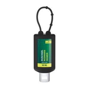Artikel-Nr: SAN20-314-241-100Praktische Kosmetikflasche zum Anhängen! Das Fläschchen mit Silikonhülle ist nicht nur optisch ein echter Hingucker! Raffiniert mit Schlaufe zum Anhängen an den Rucksack, an die Sporttasche, an den Kinderwagen oder natürlich im Bad unter der Dusche. 50 ml Flasche aus 100% recyceltem PET, transparent mit leichter R-PET-Färbung. Mit Klappdeckel "weiß" aus recyceltem PP, zufällig ausgerichtet; Silikonhülle und Schlaufe in Nachfüllbar. Das Body & Hair Duschgel mit dem Mix aus Rosmarin und Ingwer regt mit seinem umwerfend würzig-frischen Duft die Sinne an und macht das Duschen zum Erlebnis! Es entsteht ein angenehmer Schaum, der Haut und Haare reinigt und zugleich pflegt. • Vegan • pH-hautneutral • Ohne Parabene • Ohne Konservierungsstoffe • Dermatologisch getestet "Sehr gut hautverträglich" • Hergestellt in Deutschland Dekoration: Body Label: Etikett PE (weiß) auf Vorder- und Rückseite, Druck 4c CMYK. Wahlweise glänzend oder matt. Füllung: 50ml
