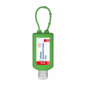 Artikel-Nr: SAN20-312-262-100Praktische Flasche zum Anhängen! Das Fläschchen mit Silikonhülle ist nicht nur optisch ein echter Hingucker! Raffiniert mit Schlaufe zum Anhängen ans Handgepäck, an den Rucksack oder an den Kinderwagen. 50 ml Flasche aus 100% recyceltem PET, transparent mit leichter R-PET-Färbung. Mit Klappdeckel "natur", zufällig ausgerichtet; Silikonhülle und Schlaufe in Nachfüllbar. Dekoration: Body Label: Etikett PE (weiß) auf Vorder- und Rückseite, Druck 4c CMYK. Wahlweise glänzend oder matt. Das alkoholische Hände-Desinfektionsgel verfügt aufgrund seiner Zusammensetzung über ein breites Wirkspektrum gegen Viren, Bakterien und Hefen. Es eignet sich für eine hygienische Händedesinfektion gemäß DIN EN 1500 bei einer Anwendung von nur 30 Sekunden. Durch die leichte Gel-Konsistenz lässt sich das Hände-Desinfektionsmittel bei der Entnahme sehr gut dosieren; bei Hautkontakt wird es sofort flüssig, so dass es sich gut verteilen lässt. Spezielle Pflegekomponenten schonen die Haut auch bei häufigerer Anwendung und halten sie geschmeidig. •Schnell wirksam gegen Corona-Viren innerhalb von 30 Sekunden •Tötet 99,99 % aller Bakterien. Begrenzt viruzid, levurozid. •Hautschonend mit Pflegekomponenten •Dermatologisch "Sehr gut hautverträglich" getestet •Inklusive gesetzlich vorgeschriebenem "tastbarem Warnzeichen" •Hergestellt in Deutschland Wirksamkeit bestätigt gemäß DIN EN 1500, 13727, 13624, 14476. Enthält pro 100 g als Wirkstoff: Ethanol (50 g/100 g), Isopropanol (25 g/100 g). Biozide sicher verwenden. Vor Gebrauch Etikett und Produktinformation lesen. Reg. Nr. UFI 1300-P0H0-7009-GENU BAuA Reg. Nr.: N-100780 Nicht in die Schweiz lieferbar.