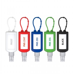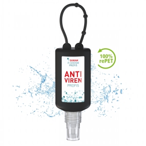 Artikel-Nr: SAN20-314-263-100Praktische Flasche zum Anhängen! Das Fläschchen mit Silikonhülle ist nicht nur optisch ein echter, Raffiniert mit Schlaufe zum Anhängen ans Handgepäck, an den Rucksack oder an den Kinderwagen. 50 ml Flasche aus 100% recyceltem PET, transparent mit leichter mit Pumpaufsatz "transparent" mit Schutzkappe; Silikonhülle und Schlaufe in Nachfüllbar. Dekoration: Body Label: Etikett PE (weiß) auf Vorder- und Rückseite, Druck 4c CMYK. Wahlweise glänzend oder matt. Das alkoholische Hände-Desinfektionsspmittel verfügt aufgrund seiner Zusammensetzung über ein breites Wirkspektrum gegen Viren, Bakterien und Hefen. Es eignet sich für eine hygienische Händedesinfektion gemäß DIN EN 1500 bei einer Anwendung von nur 30 Sekunden. Spezielle Pflegekomponenten schonen die Haut auch bei häufigerer Anwendung und halten sie geschmeidig. •Schnell wirksam gegen Corona-Viren innerhalb von 30 Sekunden •Tötet 99,99 % aller Bakterien. Begrenzt viruzid, levurozid. •Hautschonend mit Pflegekomponenten •Dermatologisch "Sehr gut hautverträglich" getestet •Inklusive gesetzlich vorgeschriebenem "tastbarem Warnzeichen" •Hergestellt in Deutschland Wirksamkeit bestätigt gemäß DIN EN 1500, 13727, 13624, 14476. Enthält pro 100 g als Wirkstoff: Ethanol (50 g/100 g), Isopropanol (25 g/100 g). Biozide sicher verwenden. Vor Gebrauch Etikett und Produktinformation lesen. Reg. Nr. UFI G600-606D-H00S-5S7W BAuA Reg. Nr.: N-100781