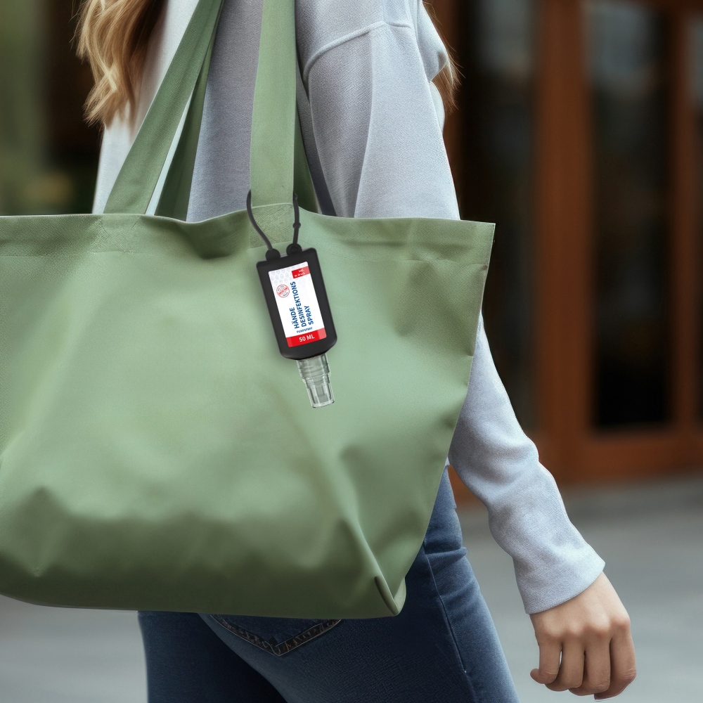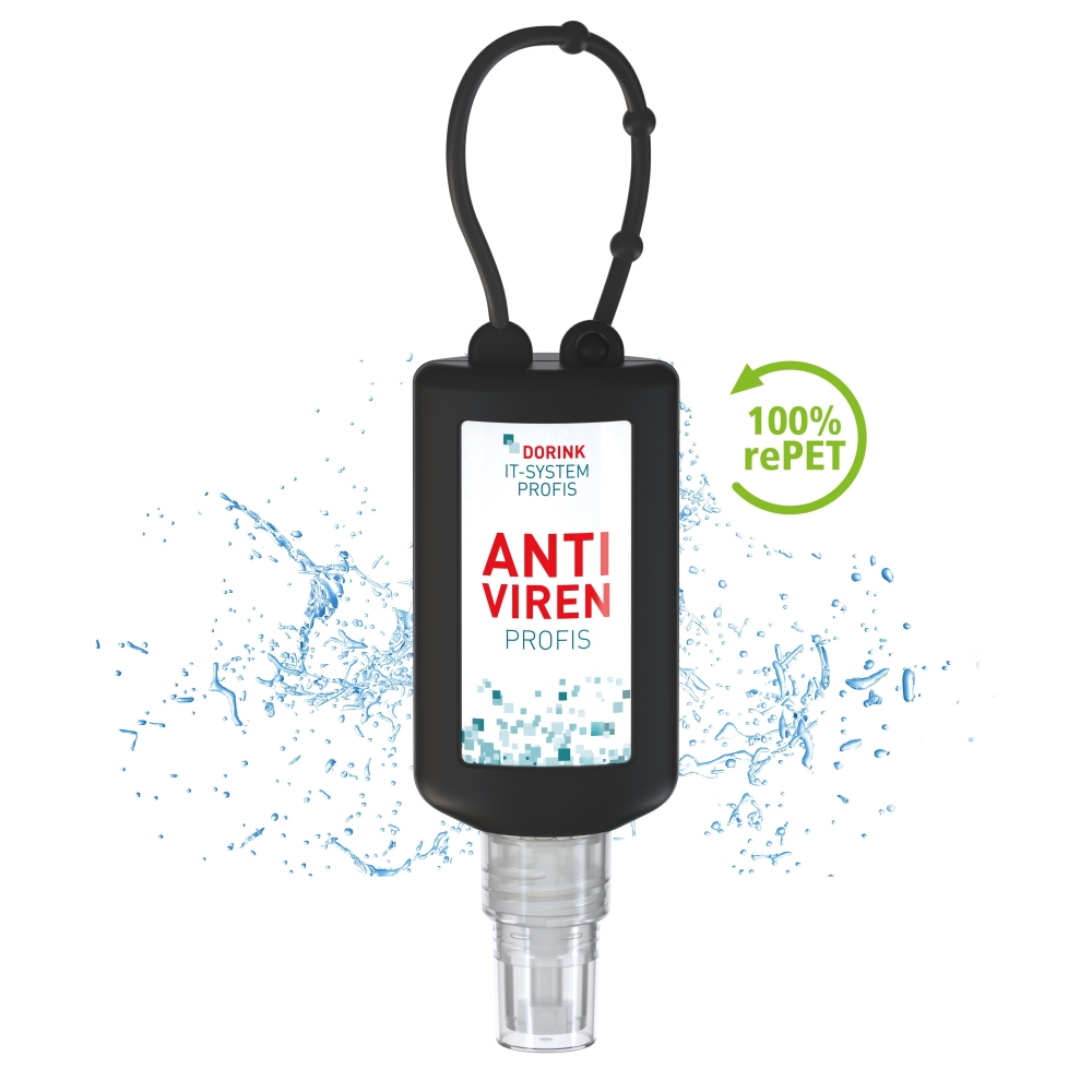Artikel-Nr: SAN20-314-263-100Praktische Flasche zum Anhängen! Das Fläschchen mit Silikonhülle ist nicht nur optisch ein echter, Raffiniert mit Schlaufe zum Anhängen ans Handgepäck, an den Rucksack oder an den Kinderwagen. 50 ml Flasche aus 100% recyceltem PET, transparent mit leichter mit Pumpaufsatz "transparent" mit Schutzkappe; Silikonhülle und Schlaufe in Nachfüllbar. Dekoration: Body Label: Etikett PE (weiß) auf Vorder- und Rückseite, Druck 4c CMYK. Wahlweise glänzend oder matt. Das alkoholische Hände-Desinfektionsspmittel verfügt aufgrund seiner Zusammensetzung über ein breites Wirkspektrum gegen Viren, Bakterien und Hefen. Es eignet sich für eine hygienische Händedesinfektion gemäß DIN EN 1500 bei einer Anwendung von nur 30 Sekunden. Spezielle Pflegekomponenten schonen die Haut auch bei häufigerer Anwendung und halten sie geschmeidig. •Schnell wirksam gegen Corona-Viren innerhalb von 30 Sekunden •Tötet 99,99 % aller Bakterien. Begrenzt viruzid, levurozid. •Hautschonend mit Pflegekomponenten •Dermatologisch "Sehr gut hautverträglich" getestet •Inklusive gesetzlich vorgeschriebenem "tastbarem Warnzeichen" •Hergestellt in Deutschland Wirksamkeit bestätigt gemäß DIN EN 1500, 13727, 13624, 14476. Enthält pro 100 g als Wirkstoff: Ethanol (50 g/100 g), Isopropanol (25 g/100 g). Biozide sicher verwenden. Vor Gebrauch Etikett und Produktinformation lesen. Reg. Nr. UFI G600-606D-H00S-5S7W BAuA Reg. Nr.: N-100781 Nur für Deutschland und Österreich erhältlich.